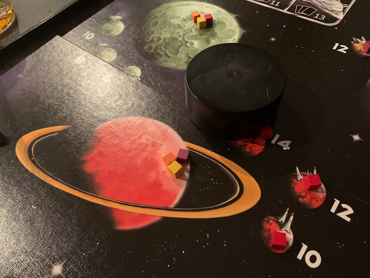 하지만 집념의 아이콘 처키님과 바라쿠다님의 한국 블로그 리뷰와 영문 매뉴얼 설명의 콤비네이션 파워에 힘입어 암호 해독하듯 하나 둘 게임 룰이 진행되었죠. 이 게임의 정수는 혹성 고리 컴포넌트입니다. 혹성 고리 안에 행성에 있는 큐브를 모두 넣고 흔들면 나오는 큐브의 종류에 따라 액션이 달라지는데요. 확률에 의거하여 로또 돌리는 느낌? 이 확실히 있습니다. ㅎㅎ 간단한 컴포넌트 활용으로 랜덤 큐브를 추출할 수 있는 아이디어가 놀라웠어요.