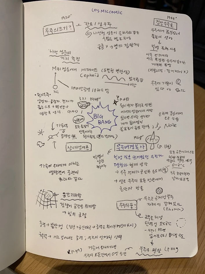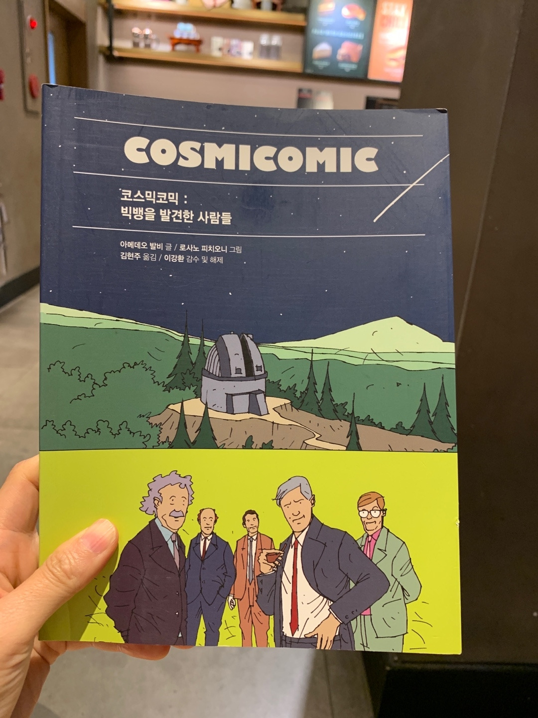 '우주'라는 주제에 맞추어 관련 책을 한 권 읽어 보아야겠다고 생각이 들어 서재를 둘러보았습니다. 예전에 사놓고 완독 하지 못했던 <코스믹코믹>이 눈에 띄었어요. 만화 형식으로 되어있어 부담 없이 읽기 좋았습니다. <코스믹코믹>는 이탈리아 천체물리학자인 아메데오 발비가 글을 쓴 점이 주목할 만합니다. 따라서 책에 나오는 이야기들은 과학자 입장에서 100% 사실인 내용으로만 구성되어 있고, 우리가 이젠 당연하게 알고 있는 '빅뱅'을 사람들이 어떻게 발견하게 되었는지에 포커싱하여 그 흐름에 따른 과학자들의 노력과 열정을 알게 합니다.