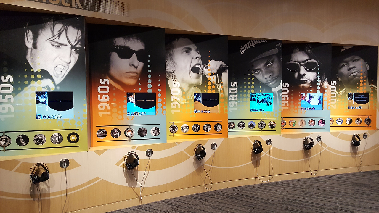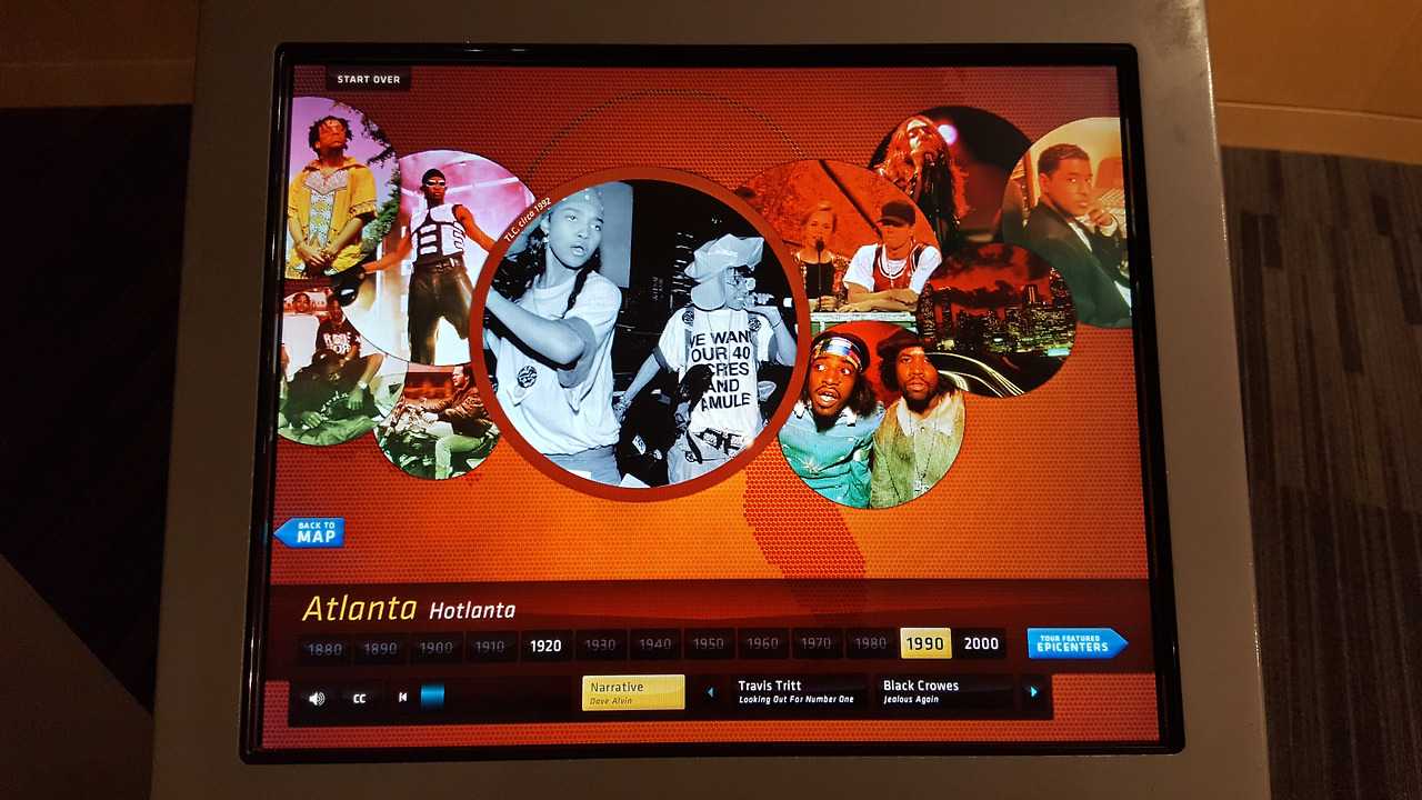 그래미 뮤지엄에서는 그래미상이 생긴 이래로 반세기동안 흘러간 음악들을 모두 만나 볼 수 있다. 단순히 보는 전시가 아니라, 음악을 들어볼 수 있는 체험 공간이 잘 구성되어있다. 처음 전시장을 들어서서 만나 볼 수 있는 것도 바로 미국 각 지역에서 히트했던 음악들을 연도와 쟝르별로 인터렉티브하게 들어볼 수 있는 키오스크였다. 한마디로 미국 음악의 연대기를 만나볼 수 있다. 서로 연계되는 음악 쟝르와 지역 특징들을 데이터베이스적으로 잘 구축되어 있어서, 본인이 좋아하는 스타일 음악의 변천사를 쉽게 탐색해 볼 수 있다. 이 키오스크와 함께라면 하루종일 뮤지엄에서 놀 수도 있을 것 같다는 생각도 들었다.