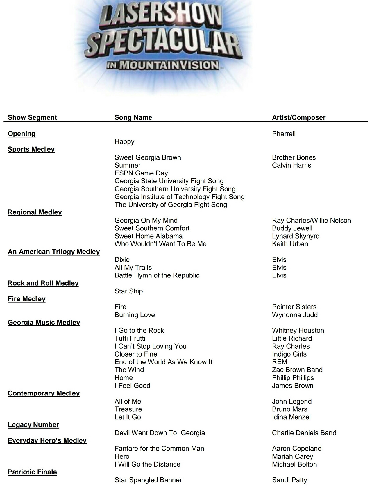 아래가 바로 음악 상영 리스트이다. 한시간 가까이 되는 레이저쇼 시간 동안 총 34곡의 음악을 들을 수 있다. 미국인들이 어떤 노래를 대중적으로 좋아하는지, 조지아를 대표하는 음악은 무엇인지를 곡 리스트를 보면 알 수 있다. 스포츠 관련 노래를 틀어주는 것도 흥미로웠고, 마지막에 미국 국가가 울려퍼지는 동안에는 모두가 일어선다. 미국인들의 군인이나 국가를 대하는 태도를 보면 애국심과 나라에 대한 자부심이 상당한 것을 느낀다.