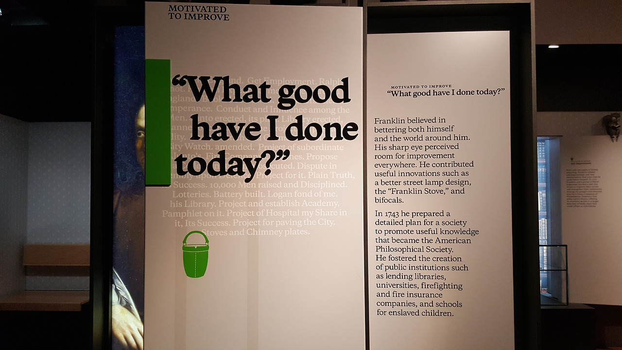 벤자민 프랭클린은 난로, 흔들의자, 피뢰침, 이중초점 안경 등 수많은 발명품을 만들었음에도 단 한 건도 특허를 받지 않았다. 이는 발명은 대중에 대한 봉사이며, 공익의 발전에 도모해야 한다는 그의 철학이 있었기 때문이다. 벤자민 플랭클린 박물관에서 글래스 하모니카라는 특별한 악기의 재발견 외에도 벤자민 프랭클린의 삶의 철학으로 부터 많은 배움을 얻을 수 있었다.