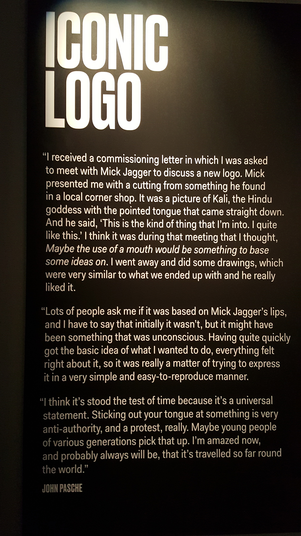 이 로고를 나도 믹 재거의 두툼한 입술에서 따왔는 걸로 알고 있었는데, 전시 내용 중 로고에 대한 디자이너의 자세한 설명도 확인해 볼 수 있었다. 원래는 Kali라는 힌두 여신의 이미지에서 부터 유래되었다고 한다. Kali의 이미지를 찾아보니 무시무시한 폭력성이 느껴지는데, 혀를 내민 기묘한 표정이 인상적이다.