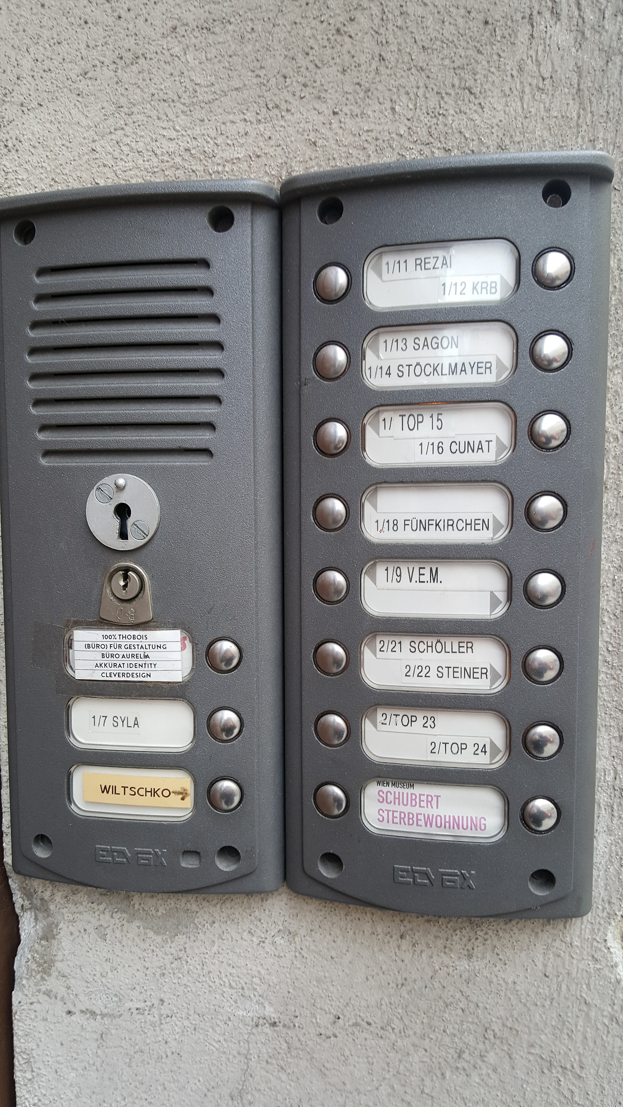 이 곳은 입구가 개방되어 있지 않고 초인종을 누르게 되어 있었다! 잘못 누르면 다른 집에 호출을 할 수도 있다고 생각하니 왠지모르게 긴장이 되면서도, 슈베르트 집에 놀러가서 '띵동' 초인종을 누르면 슈베르트가 '안뇽!'하고 맞아주는 건가 하는 설레임도 느껴졌다. 버튼을 누르니 물어보지는 않고 바로 문이 띠- 하고 열린다. 터벅터벅 안으로 걸어들어가본다.