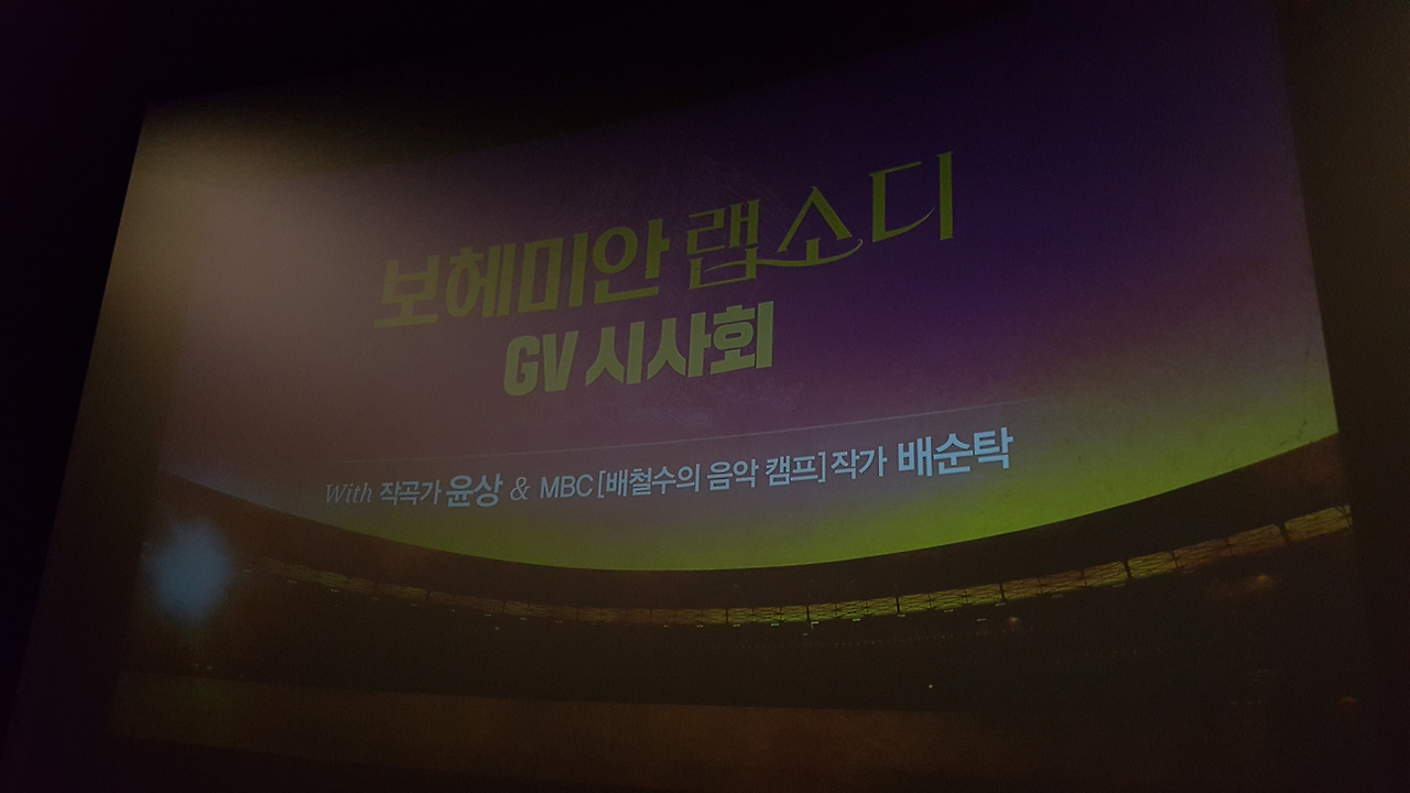 아이맥스가 큰 스크린 뿐만 아니라 음악도 저음부에 진동이 느껴질 정도로 사운드가 괜찮다는 리뷰에 아이맥스 관람을 언제할지 고민하고 있었다. 마침 작곡가 윤상과 배철수의 음악캠프의 작가 배순탁의 GV가 용산 CGV 아이맥스관에서 열린다는 소식을 접했다. 윤상이라니! 평소 좋아하는 음악가의 관점에서는 이 영화를 어떻게 봤을지 궁금해졌다. 아이맥스 관람객에게는 포스터를 증정하는 이벤트가 있었던 것도 반가웠다.