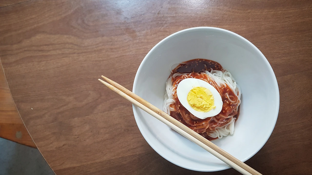 양념은 초고추장 가득 2큰술, 다진 마늘 가득 1작은술, 매실액 1큰술, 꿀 1작은술, 참기름 1큰술, 깨 약간. 소면은 물이 끓어오를 때 찬물을 한 번씩 부어 탱글한 탄력을 지켜냈다. 국수 몇 번 만들어봤다고, 퍼지지 않게 잘 삶는다. 찬물에 바로 박박 씻어 전분기도 씻어냈다. 계란도 삶아냈다. 지극히 한국적인 맛을 낼 수 있는 재료들이 모두 모였다.