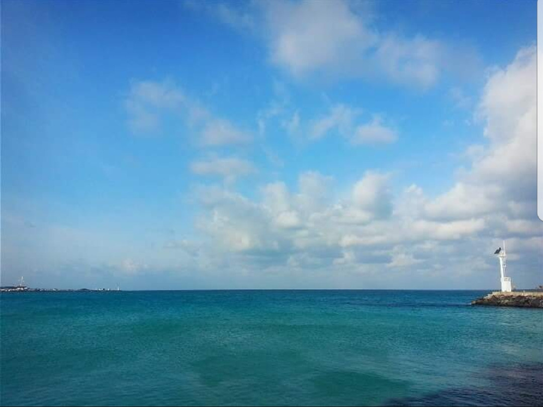 하늘은 몽글몽글하고, 바다는 옥빛입니다.