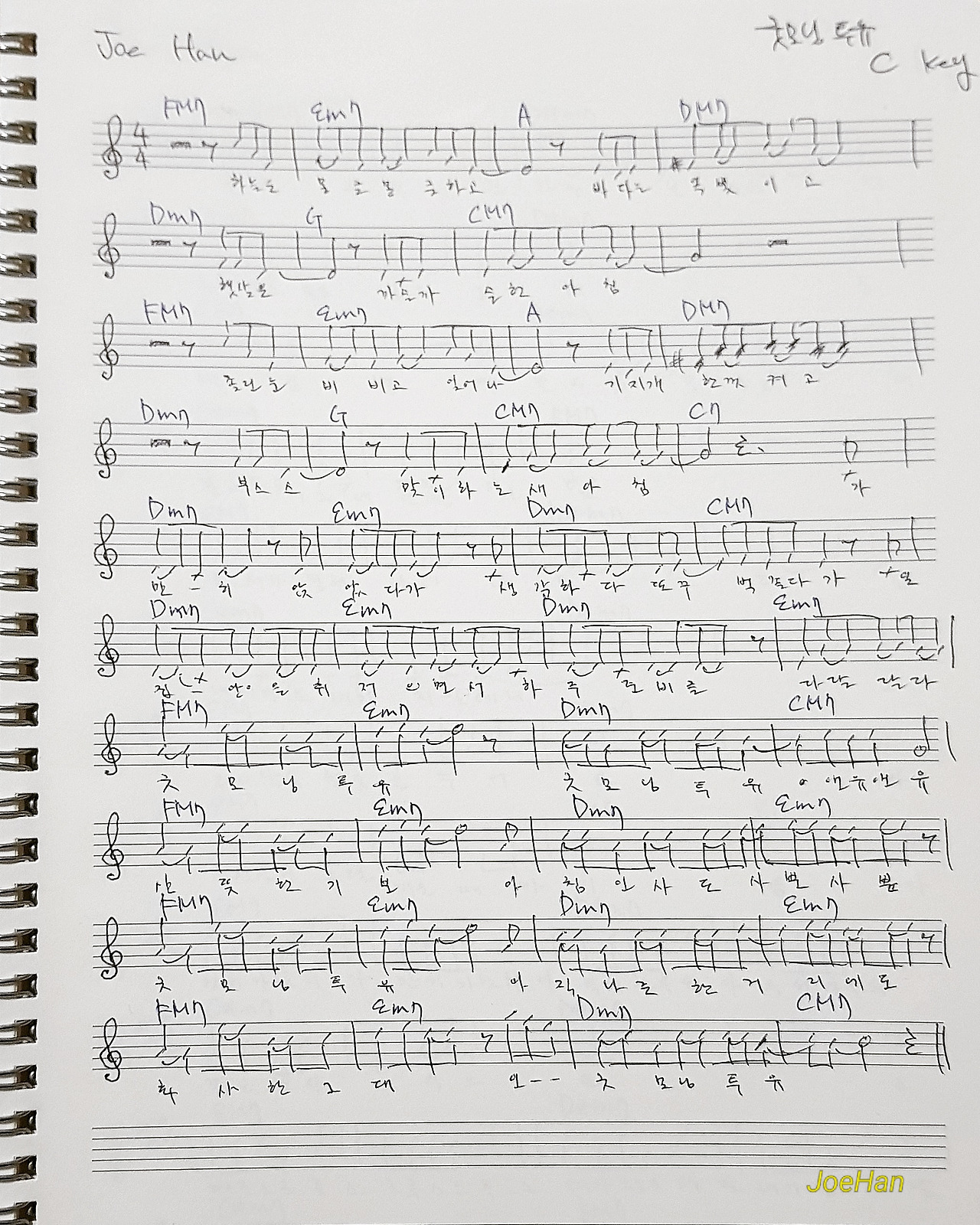그런데 '굿 모닝 투 유'는 최종 녹음을 앞두고 C키로 바꿨습니다. 연습을 수차례 진행하고, 녹음실에서 가녹음도 해보았는데, B키가 '굿 모닝 투 유'의 곡 분위기에도, 내 목소리에도 썩 적당하지 않다는 결론을 내렸기 때문입니다. 그래서 결국 실제 C키로 올려서 녹음하게 되었고, 곡에는 EM7 대신 FM7 코드가 쓰이게 됩니다.