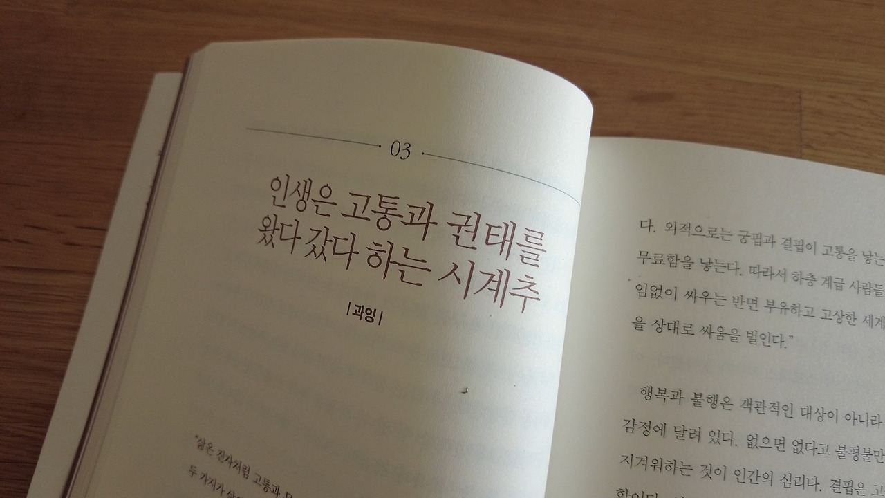 행복하게 산다는 건 고통을 견딘다는 것. 행복한 인생을 결정짓는 진정한 가치는 고통을 잘 견뎌내는 인내력에 있다. 세상에서 가장 큰 행복을 누리는 사람은 역설적으로 덜 불행하게 살 수 있는 용기가 있고, 고통을 그럭저럭 견뎌 내면서 하루하루를 묵묵히 살아가는 사람이다. [마흔에 읽는 쇼펜하우어 중에서]