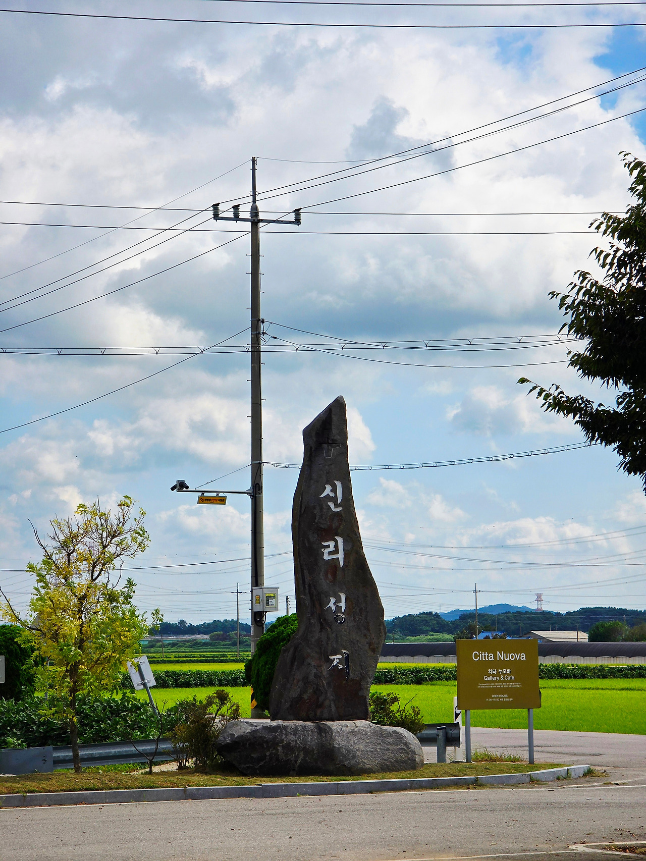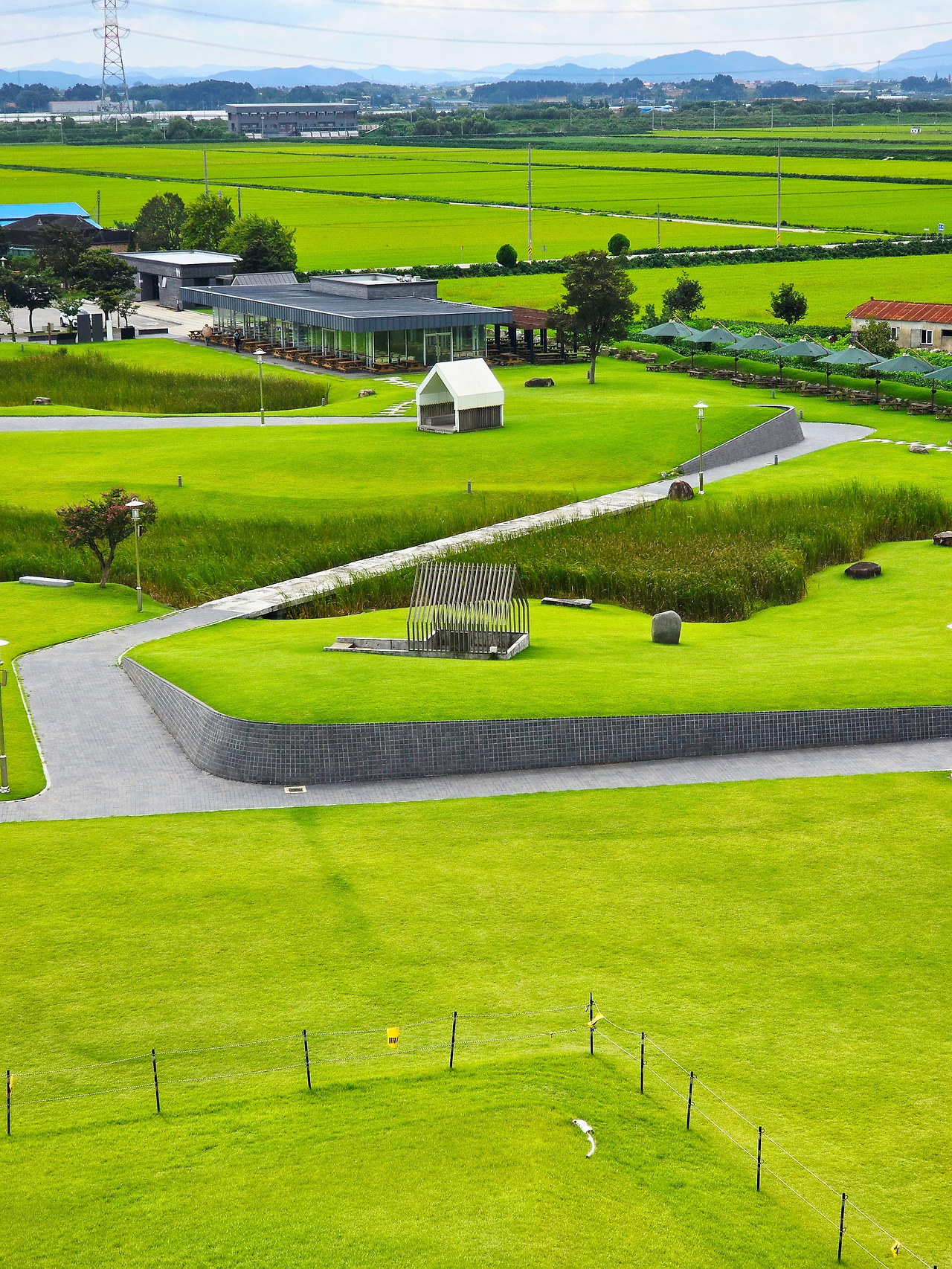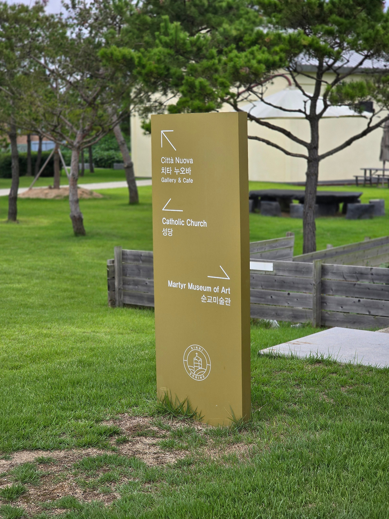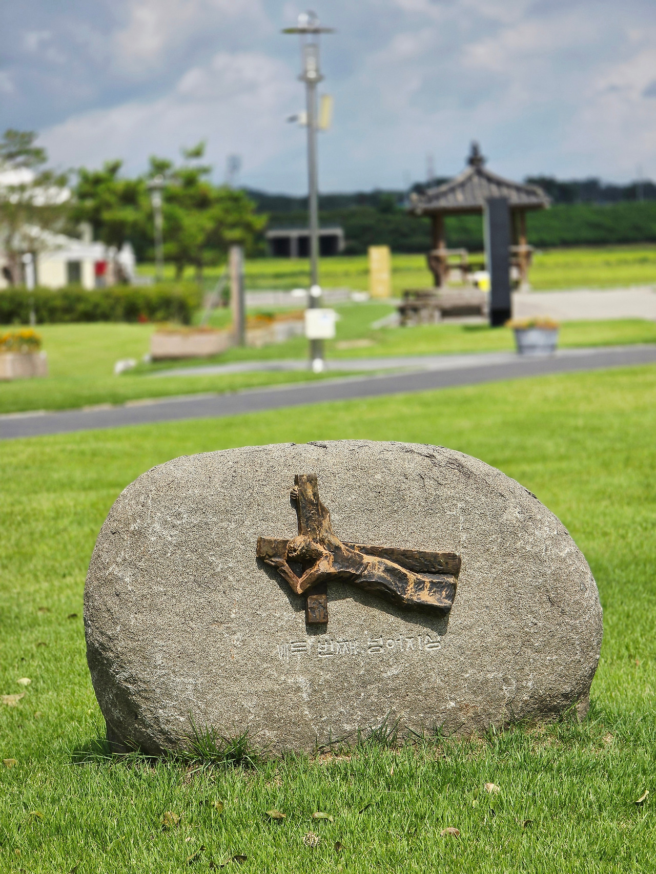 서울 하늘은 흐리고 비가 내렸지만, 당진에 가까워질수록 날씨는 맑게 개었다. 평야를 가르는 2차로를 따라가면 논 사이로 바람결이 헤집어 놓은 물빛이 반짝이고, 길은 낮은 지평선 속으로 풀리며 들판 한가운데 느닷없이 신리성지가 나타났다. 높은 산도 빌딩도 아파트도 없는, 시야가 통째로 열리는 풍경—소셜미디어에서 ‘풍경 맛집’이라는 표현이 과장으로 들리지 않는 순간이었다. 주차를 마치고 입구로 들어서자 초록의 뜰은 곧 묵상의 호흡으로 바뀌고, 잔디 구릉 위로 탑과 십자가가 떠올랐다. 순교미술관·야외성당·십자가의 길은 점과 선으로 이어져 공간 자체를 하나의 기도로 엮었다. 멀리 표지판은 버그내순례길의 다음 행선지를 가리키듯 솔뫼성지를 일러 주고, 표지판이 드문 구간조차 시야의 평온함이 길을 밝혀 주었다.