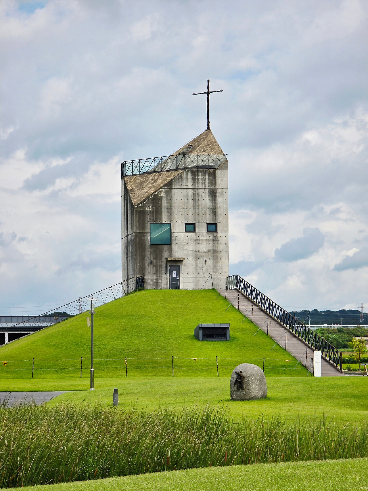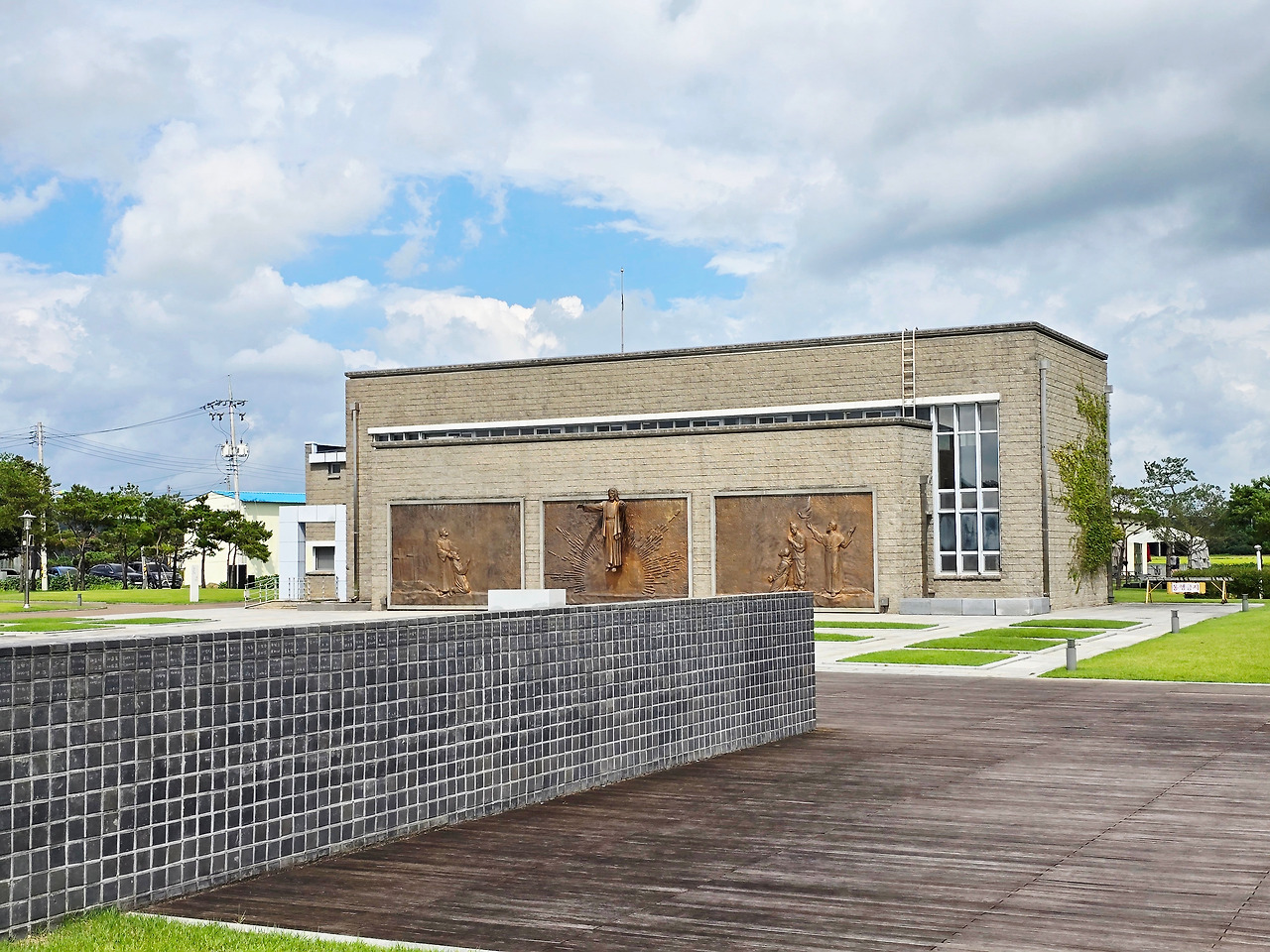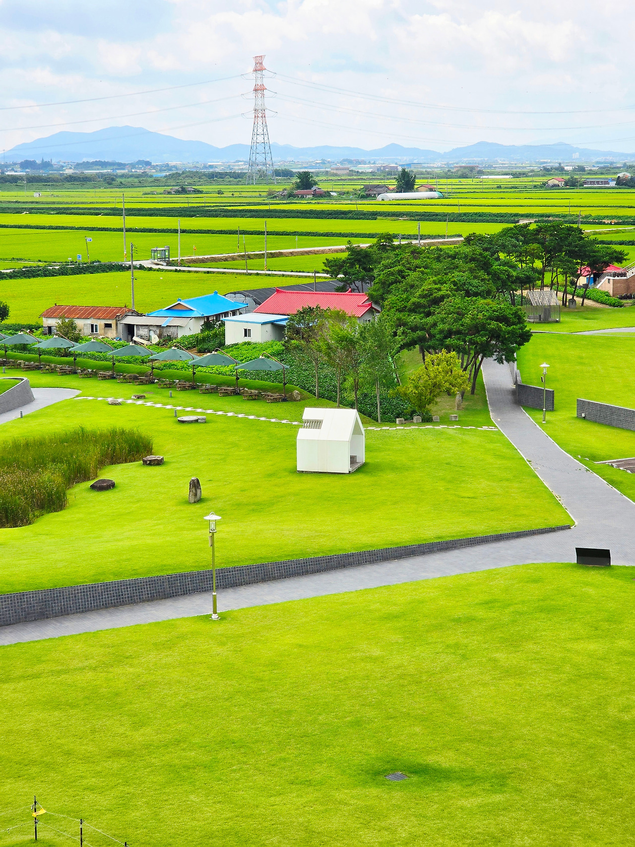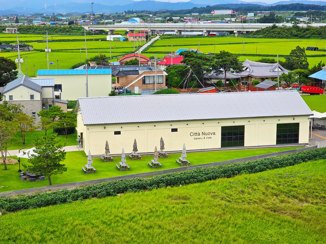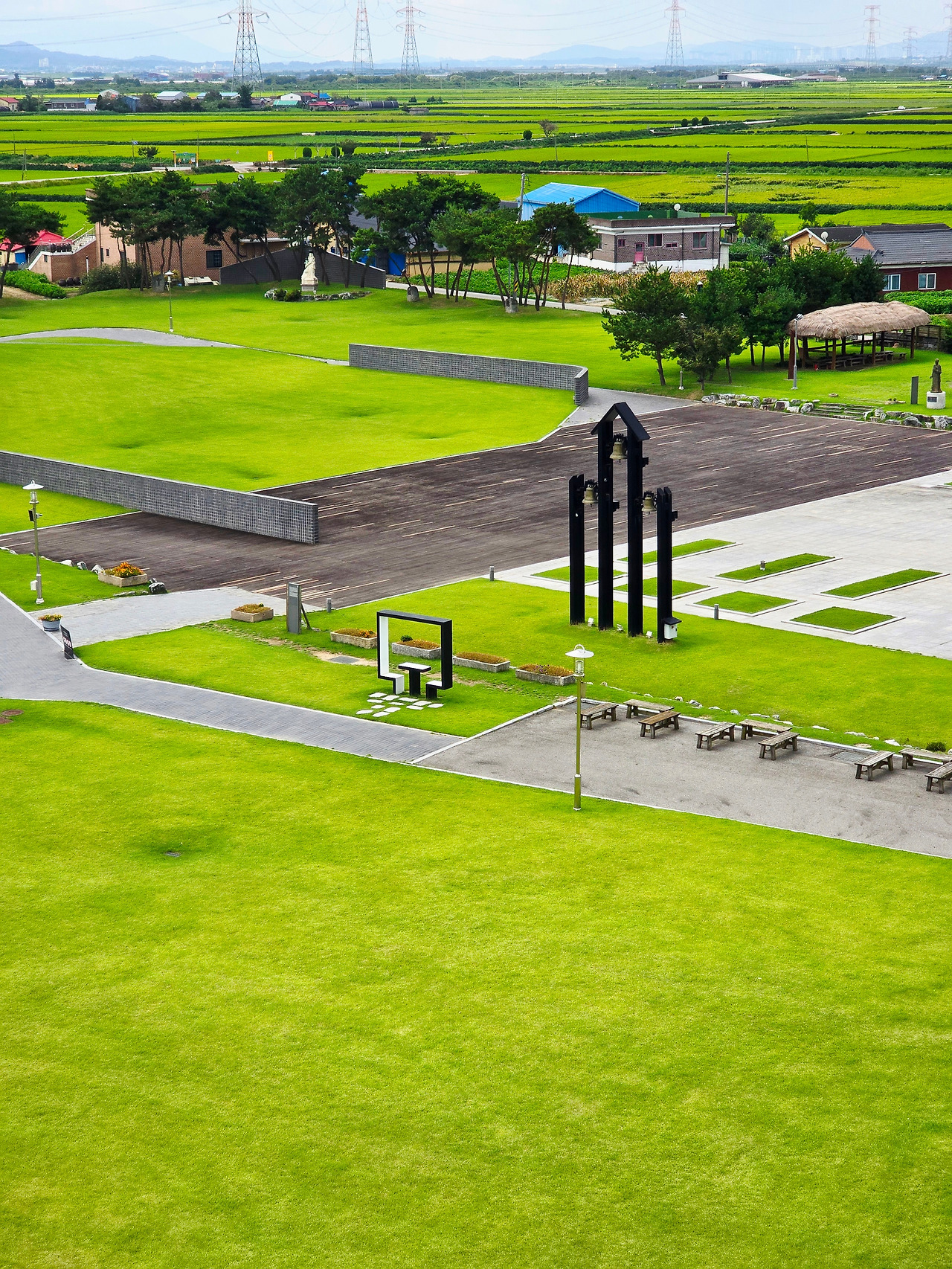 서울 하늘은 흐리고 비가 내렸지만, 당진에 가까워질수록 날씨는 맑게 개었다. 평야를 가르는 2차로를 따라가면 논 사이로 바람결이 헤집어 놓은 물빛이 반짝이고, 길은 낮은 지평선 속으로 풀리며 들판 한가운데 느닷없이 신리성지가 나타났다. 높은 산도 빌딩도 아파트도 없는, 시야가 통째로 열리는 풍경—소셜미디어에서 ‘풍경 맛집’이라는 표현이 과장으로 들리지 않는 순간이었다. 주차를 마치고 입구로 들어서자 초록의 뜰은 곧 묵상의 호흡으로 바뀌고, 잔디 구릉 위로 탑과 십자가가 떠올랐다. 순교미술관·야외성당·십자가의 길은 점과 선으로 이어져 공간 자체를 하나의 기도로 엮었다. 멀리 표지판은 버그내순례길의 다음 행선지를 가리키듯 솔뫼성지를 일러 주고, 표지판이 드문 구간조차 시야의 평온함이 길을 밝혀 주었다.
