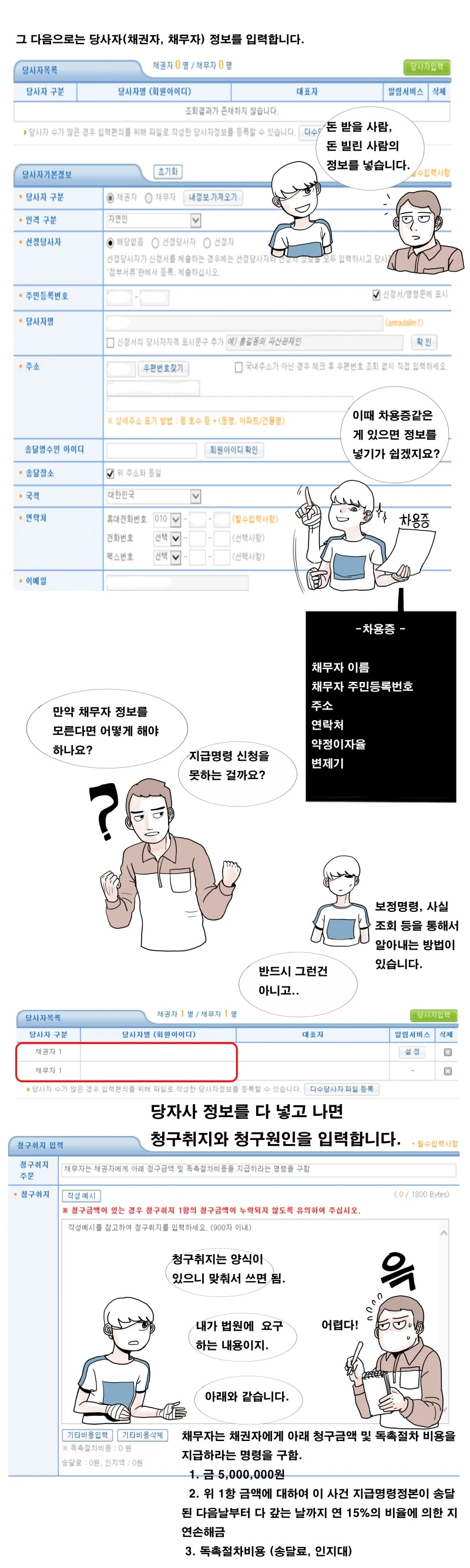 게다가 일반 민사소송과 달리 지급명령신청은 채무자를 법정에 불러서 항변할 기회를 주지 않기 때문에 법원에게 어떤 채권이 있고 그 돈이 정확히 얼마인지를 차분하게 잘 설명하는 것이 필요합니다.
