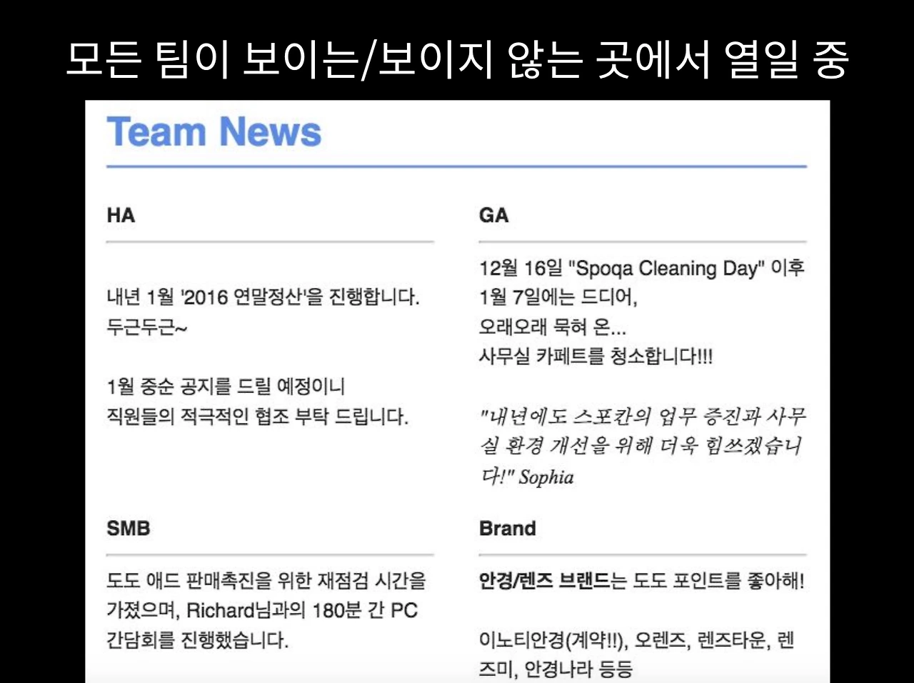 모든 팀이 보이는, 보이지 않는 곳에서 열일 중! 가시적인 성과를 내고 직접적 매출을 내는 팀만이 주목과 박수를 받을 이유는 전혀 없어요. 모든 팀이 의미 있고 중요한 일을 하니까요. 이 뉴스레터는 외부 공개용이 아니었기 때문에, 사내 대외비 프로젝트도 투명하게 다른 팀에게 공유할 수 있도록 모두 적었습니다. 실제로 팀 뉴스를 보고 팀 간 소통이 잘 되는 것 같다는 피드백도 종종 있었습니다.