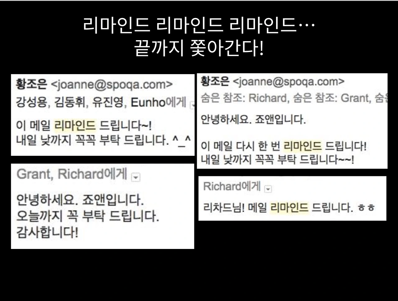 타 부서나 대표님께 정보와 자료를 요청할 일이 비교적 많은 홍보팀의 경우, 우리의 기대처럼 제때 자료를 받는 일은 정말 힘듭니다. 특히 이 뉴스레터는 모든 팀의 팀장, 동호회의 동호회장, 각 경영진, 도도패치 주인공 등 매달 협조를 구해야 할 대상이 정말 많았습니다. 리마인드의 리마인드의 리마인드를 수없이 반복합니다. 뉴스레터를 읽을 다른 직원들을 위해 정말 끝까지 쫓아갔습니다. 그래서 매달 팀장님들을 귀찮게 했지요.^0^..