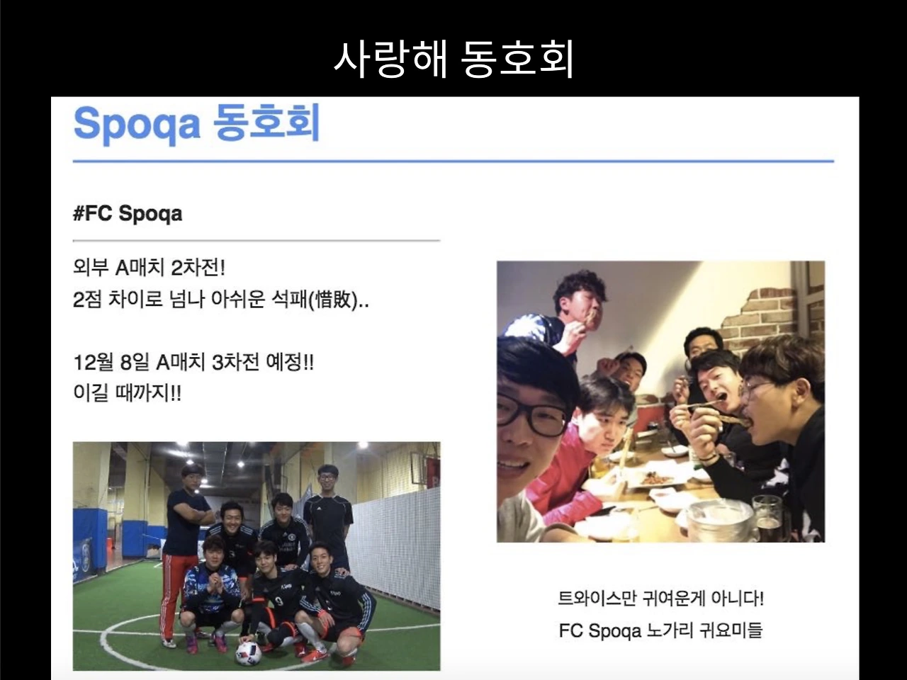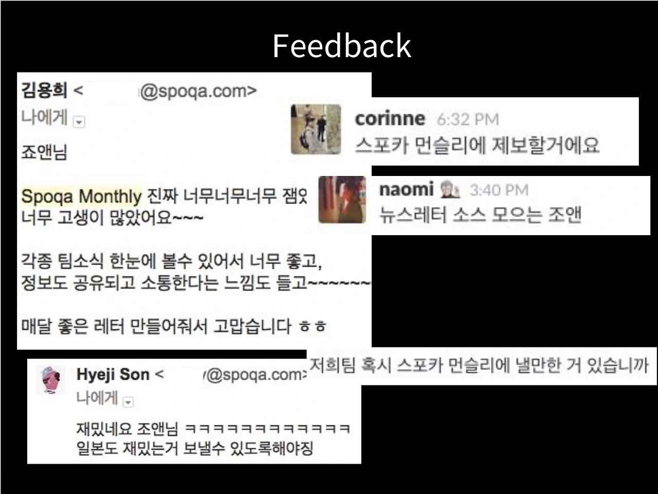 이렇게 Spoqa monthly를 11달을 만들었습니다. 퇴사하는 달에 마지막 뉴스레터를 발송하면서 괜시리 코끝이 찡하더라고요. 직원들에게 작게나마 활력을 주고 싶어서 시작한 일이었는데 결국 저 자신에게 가장 큰 추억과 성장을 선물해 준 업무였습니다. 사내 소통에 문제 의식을 느꼈고, 우리 회사에 꼭 맞는 방식이 무엇일지 고민하며 해결하려 노력했던 좋은 경험이었습니다. 업무라기보다도 매순간 회사와 직원을 들여다보며 열정적이고 즐겁게 임했습니다.(그렇게 기억합니다ㅎㅎ)