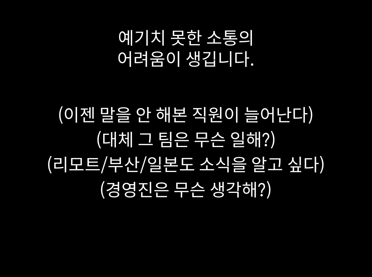 3. 재택근무자, 지방&해외 팀들은 본사에서 일어나는 소식을 잘 모른다.