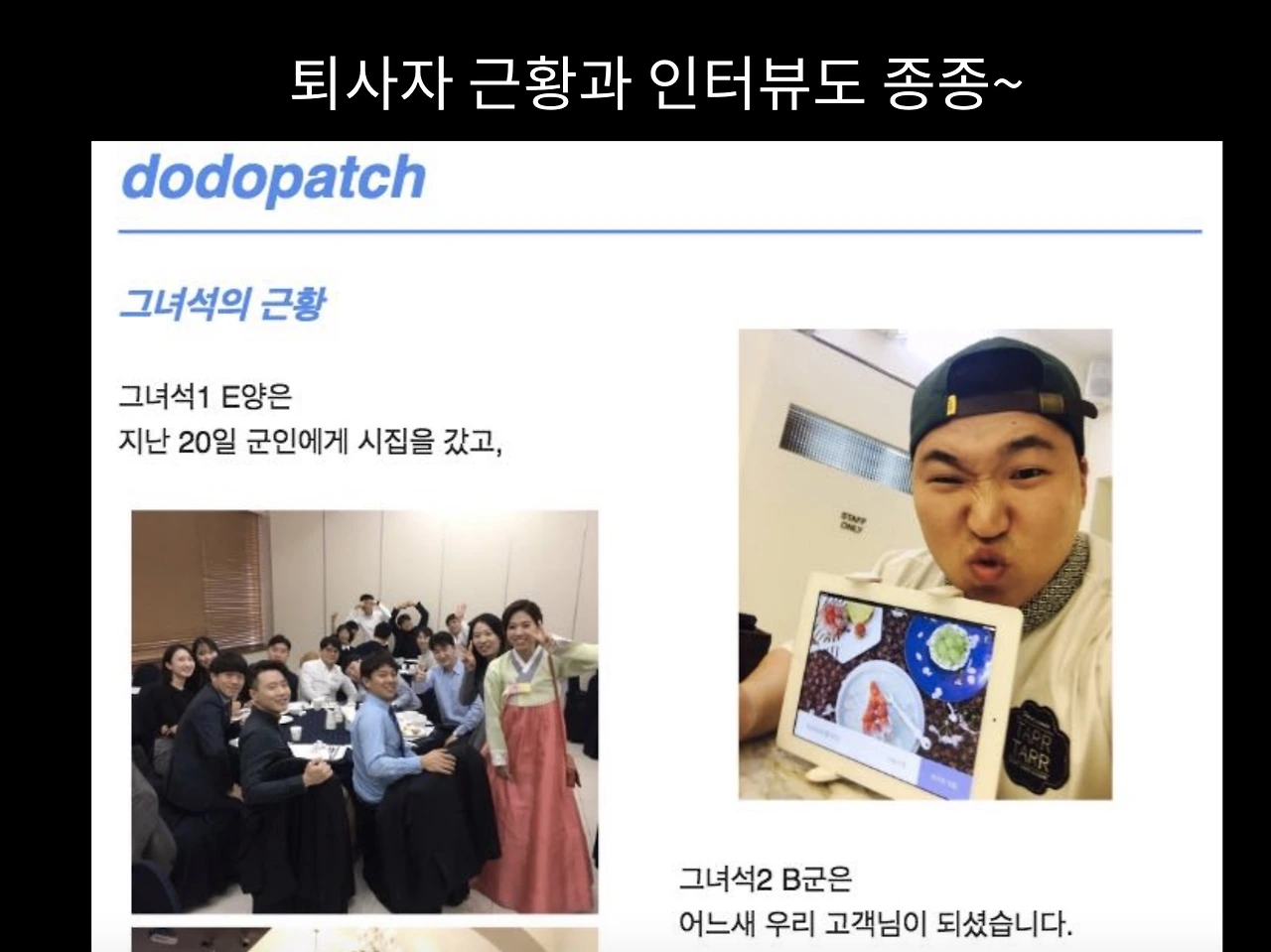 퇴사한 사내커플의 결혼 소식을 인터뷰로 꾸미기도 했고, 매장을 차려서 회사 고객이 된 퇴사 멤버의 근황을 알리는 등 잊혀질 뻔 했던 퇴사자 소식도 종종 전했습니다.