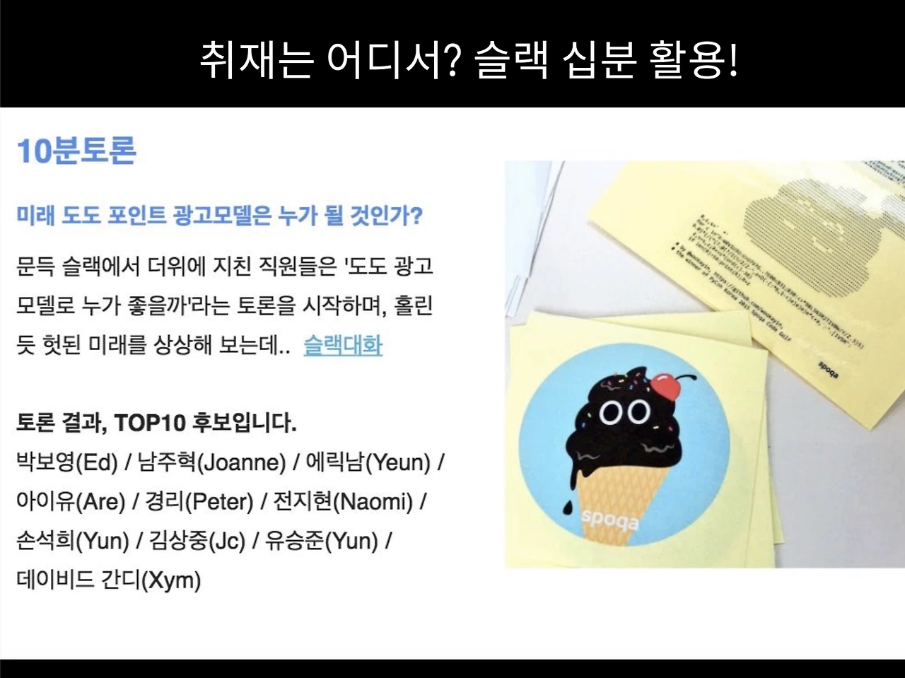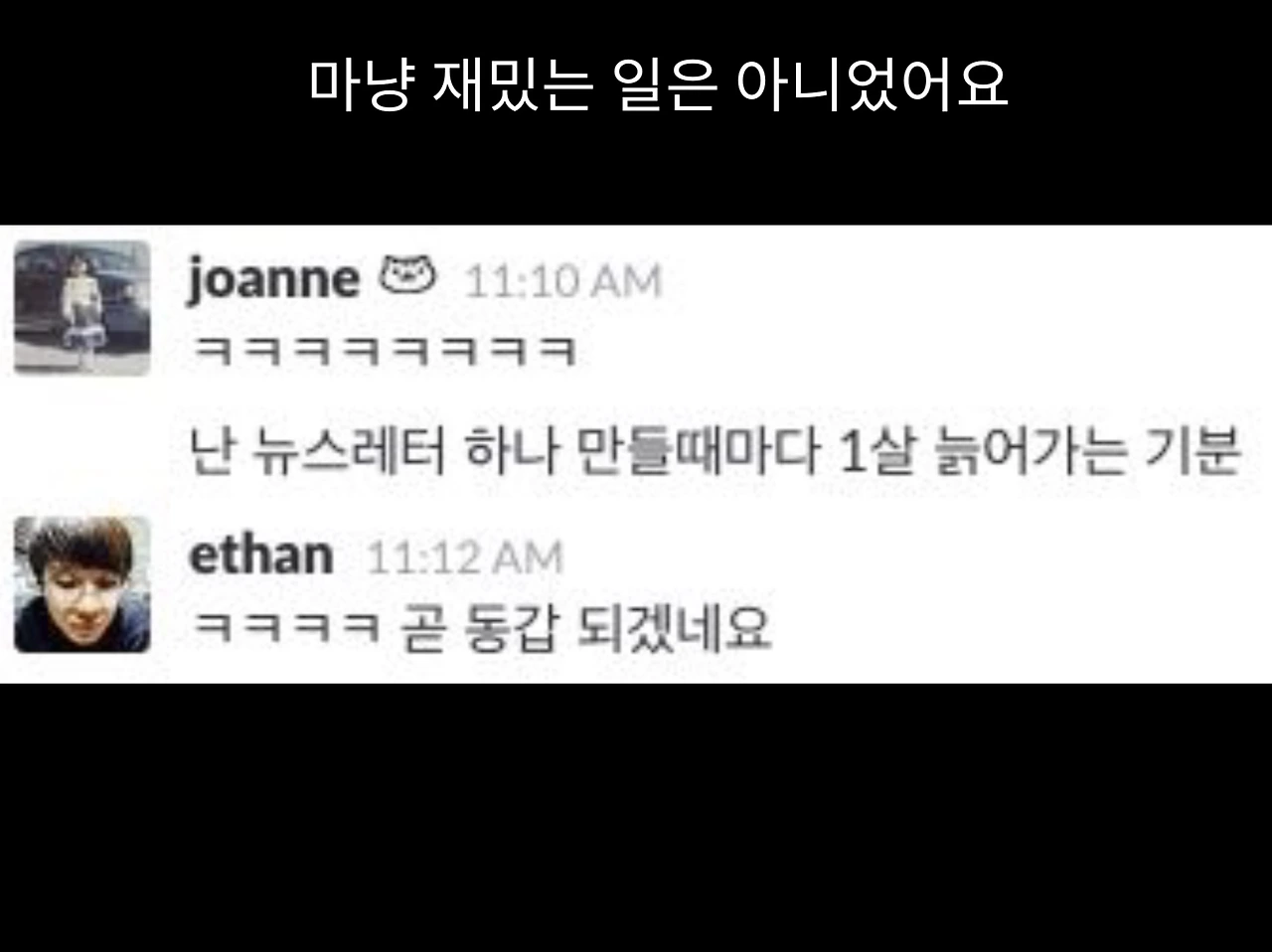 사내 메신저로 사용했던 슬랙(Slack)은 기사 소재가 넘쳐나는 공간이었습니다. 꼭 뉴스레터 때문이 아니라도, 슬랙을 정말 유용하고 재밌게 사용했는데요. 거의 하루종일 쉬지 않는 슬랙의 채널들에서 뉴스레터에 소개할 법한 내용을 발견하고 캡쳐하는 게 습관이 될 정도였습니다.