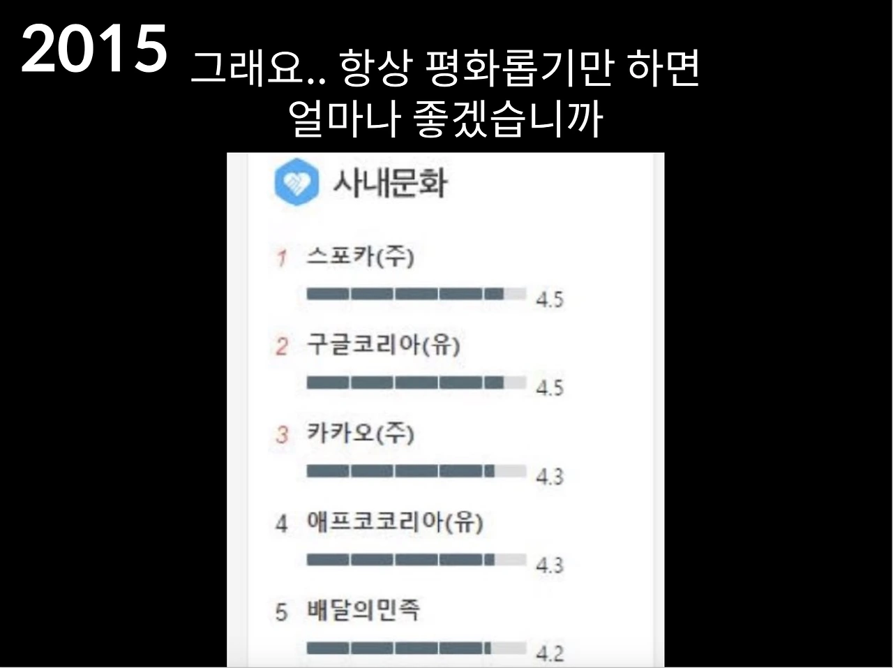 진짜 이럴 때가 있었어요. 2015년 어느 날 잡플래닛의 사내문화 랭킹에서 구글코리아, 카카오, 배달의민족과 순위를 나란히하며 1위로 랭킹된 적이요. 말로만 듣던 J커브 위에서 회사는 빠르게 성장했고, 직원 수도 입사할 때보다 2.5배 많아졌습니다. 어느새 100명 가까이 육박했지요.