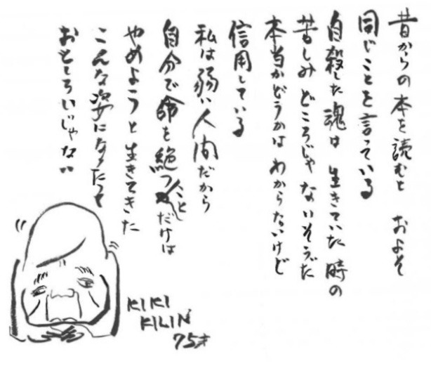 키키 키린 씨는 생전 많은 일반인들에게 친필 편지를 보낸 사실이 드러났다. 장래의 진로에 대해 고민하는 젊은이나 학교에서의 집단 따돌림의 트라우마를 겪는 사람, 영화 촬영 당시 만났던 한센병 환자나 심지어 광고 촬영 당시 방문했던 조그마한 마을에 까지 그녀의 편지가 전달되었다 그녀가 전달하고자 하는 메시지는 심플했다. 사람은 각각 다르고 누구나 자기 몫의 삶을 충분히 가지고 태어난다 라는 지극히 당연한 철학이다. 작년 이맘때의 인터뷰에서 키키 키린 씨는 다음과 같이 밝힌 적이 있다. “저는 배우를 하기 위해 인간으로서 사는 것이 아니고, 인간으로 살기 위한 한 형태로서의 배우라는 직업으로 여러분들과 만날 수 있었다는 감각이 있기에 여러분이 제 스승입니다.”