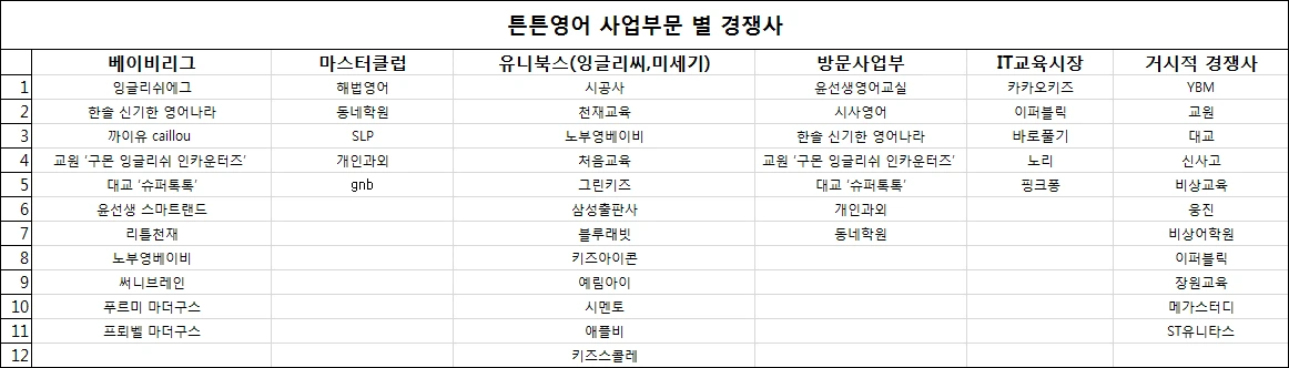 기사 리서치를 통해 얻은 시사점은 영어교육시장은 경쟁력만 있다면 삼대가 먹고사는 시장이란 생각이 들었다. 또한 한국의 영어 콘텐츠가 해외에서도 좋은 평가를 받고 있어 수출도 활발한 것을 발견했고 이미 우리 회사도 수출을 진행한 적 있다. 콘텐츠 경쟁력으로도 손색없이 성장해온 회사라는 것도 위와 같은 리서치를 포지셔닝을 확실히 할 수 있었다.