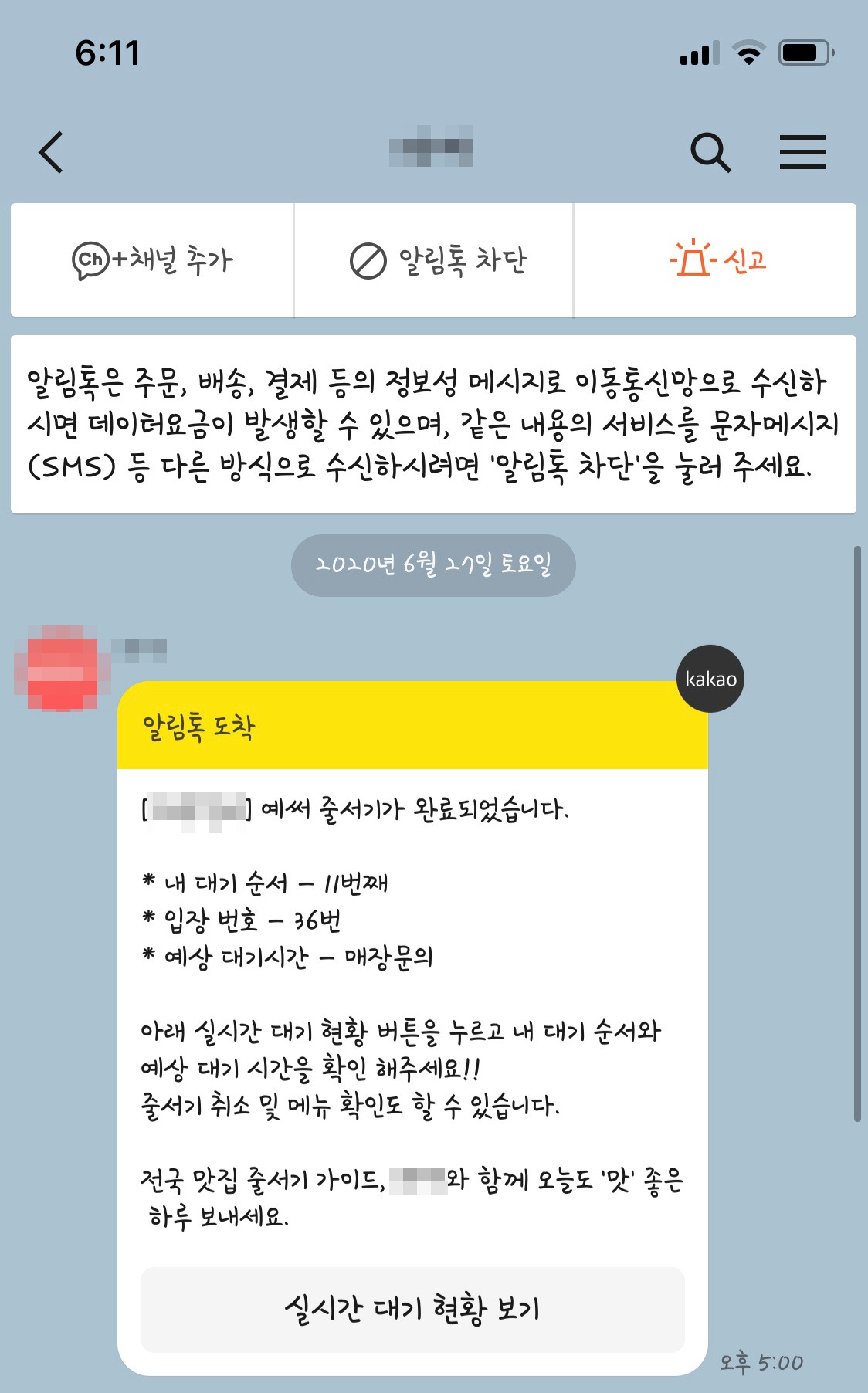 내 번호가 정상적으로 등록됐고 자세한 웨이팅 현황을 보려면 채팅 말풍선 하단에 버튼을 클릭하도록 되어있었다. 확인해보니 내 웨이팅 번호는 36번이고 11번째 웨이팅 고객이라고 한다. (또 3번째 순서가 되면 꼭 음식점 앞에서 기다리라고 안내가 있었다.)