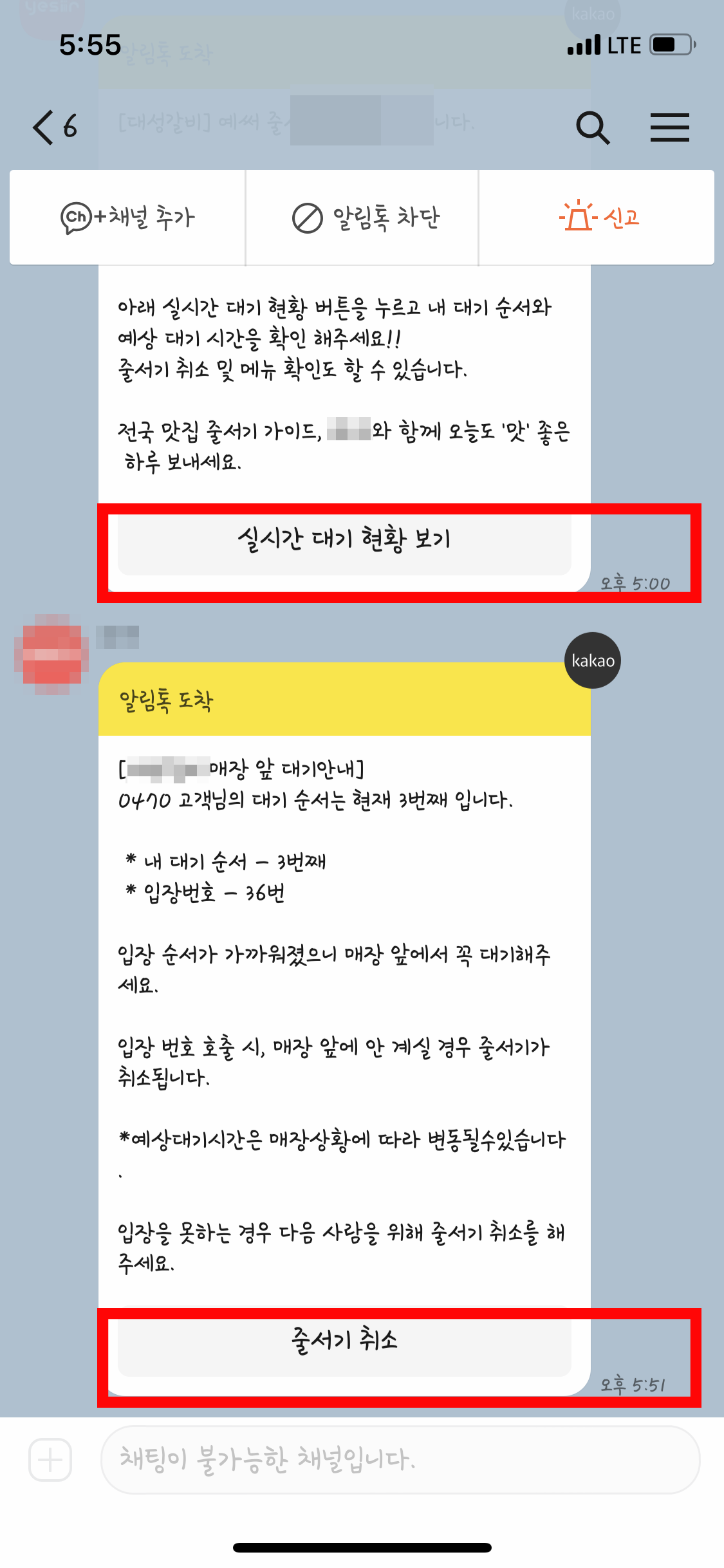 입장을 앞둔 3번째 팀이니 가게 앞에 와달라는 안내와 함께 이전 알람에서 실시간으로 내 정보를 확인하라는 버튼은 [줄 서기 취소] 버튼으로 바뀌어있었다.