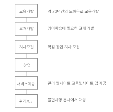 이와 같은 흐름으로 각 고객군에게 서비스가 제공되고 있다. 현재 회사에서 문제점으로 인식하고 있는 것은 개발 기간이 다소 긴 사이클을 갖고 있다는 것이다. 또 서비스 제공 시 창업자의 고충과 원생들의 불편함 등을 개선하기 위해 연구하고 논의하고 있다.