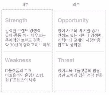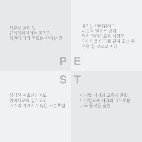 현재 영어교육 시장이 포화라 파이는 동일하지만 먹으려는 입이 많은 상황으로 알 수 있고 이 상황에서 어떠한 경쟁력을 가져야 시장을 완벽하게 장악하느냐는 모두가 고민해야 할 문제이다.
