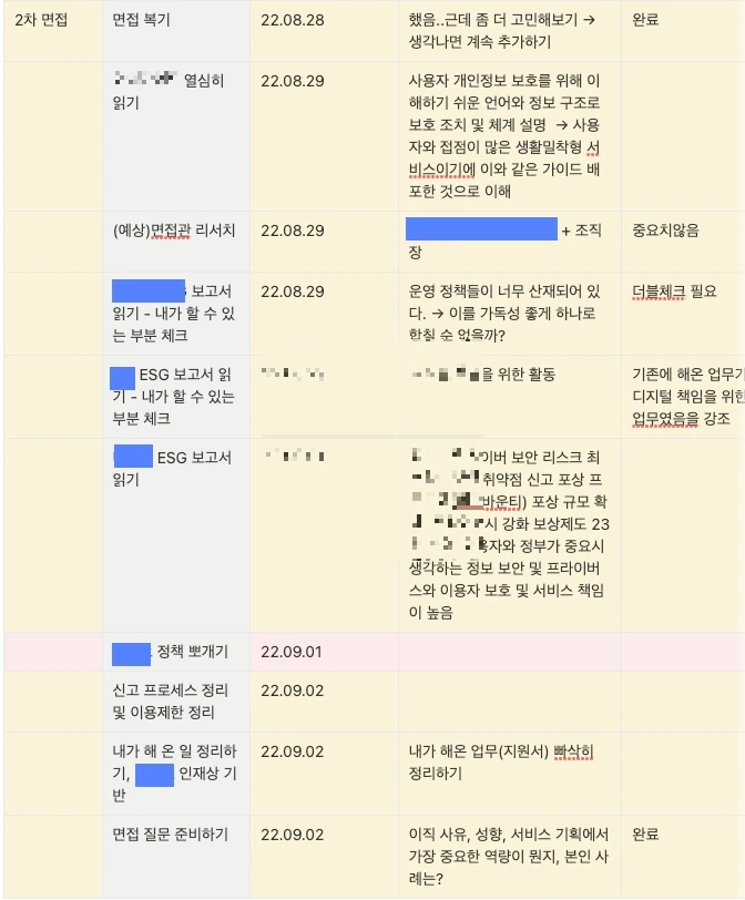 이 모든 분석 과정을 끝내고 급급하게 1차 면접 준비를 시작했다. 질문 답변 정리를 면접일 2일 전에 시작해서 마음이 다급했지만 아래 표처럼 정말 방대한 정보를 정리하고 팔로 업했다. 그러니 '나만큼 이 서비스 이렇게 고민해온 사람 없을걸?' 이 마음으로 내 불안감을 잠재울 수 있었다.