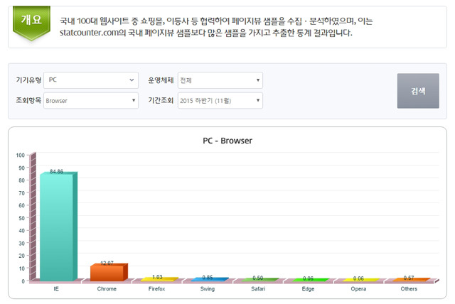 여기서 중요한 것은 현재 사업부의 가맹점들과 고객들 대부분 explorer 브라우저를 사용한다는 것이다. 특정한 직업군이 아니라면 한국에서는 explorer의 사용비율이 압도적으로 높다.