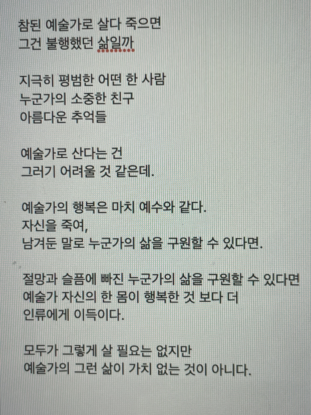 혼자 있을 땐 죽음을 앞둔 나의 삶이 무의미하다고 느껴지기도 합니다. 하지만 누군가와 같이 있을 땐 죽음이 오기 전 더 누군가를 위해 살아야겠다 생각하게 됩니다.