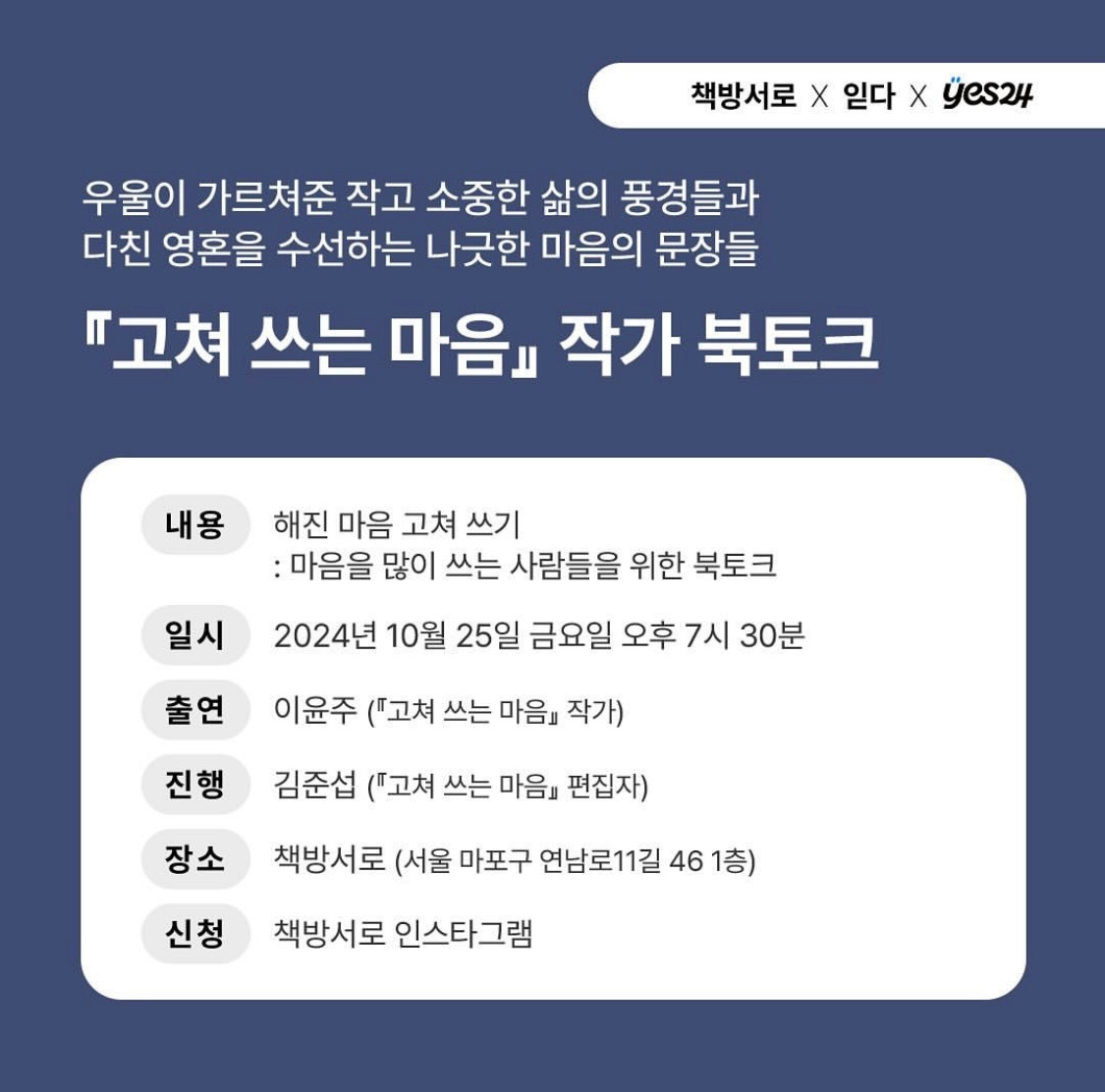 공간 여건상 열 분만 초대한다고 해요. 신청은 책방서로 인스타그램 메시지로 하시면 되어요.