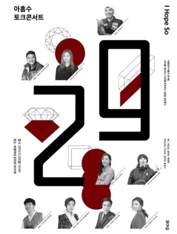 2015년 12월 20일 일요일 3시. 아홉수 토크콘서트. I hope so라는 곳에 가서 굉장히 큰 충격을 받았다. 당시 내가 28살 때였고, 29살의 사람들이 강연회를 주최한 것이었다. 단 1살 차이밖에 안 되었는데. 어떻게 하여 그들은 괄목할만한 성과를 내었는가? 부럽기도 하고, 작디작은 내가 초라하게 느껴지기도 했다. 관중이었는데 관종이라서 나도 강연가의 길로 들어서게되었다. 아마 이 때쯤이 거의 시발점이지 않나 싶었다. 강한 부러움, 강한 자괴감 등의 여러가지 감정들을 느꼈었다. 솔직한 편이라 다 털어놓는다. 아직도 나는 그들을 존경하고, 그들과 함께 성장한다고 생각한다.