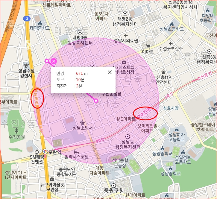 인근 지하철까지의 거리는 반경으로 측정해 보면 도보로 10분안에 도달 가능합니다.