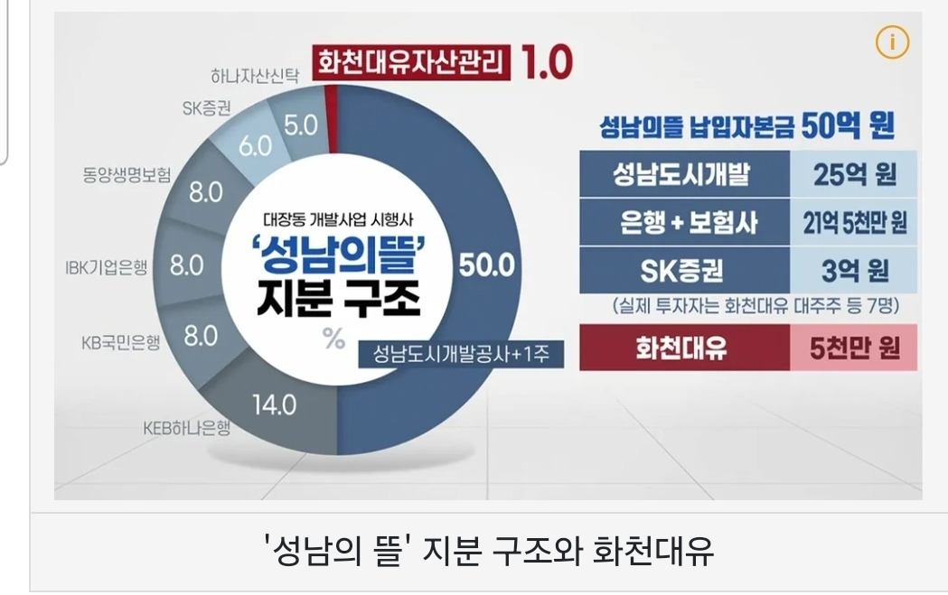 2. 2009년 당시 성남시장은 한나라당 출신 이대엽, 시의회도 다수가 한나라당이었고, 대통령은 이명박이었다. 판교 남쪽 대장동은 개발제한구역을 풀어 신도시로 만들려는 정책이 발표되었고, 일반적으로 LH(한국토지주택공사)가 토지를 정리하고 공공분양과 민간분양을 진행하는 방식 대신 민간 주도로 개발하겠다는 청와대의 의지가 반영되었다. 꽃놀이패였을 것이다.
