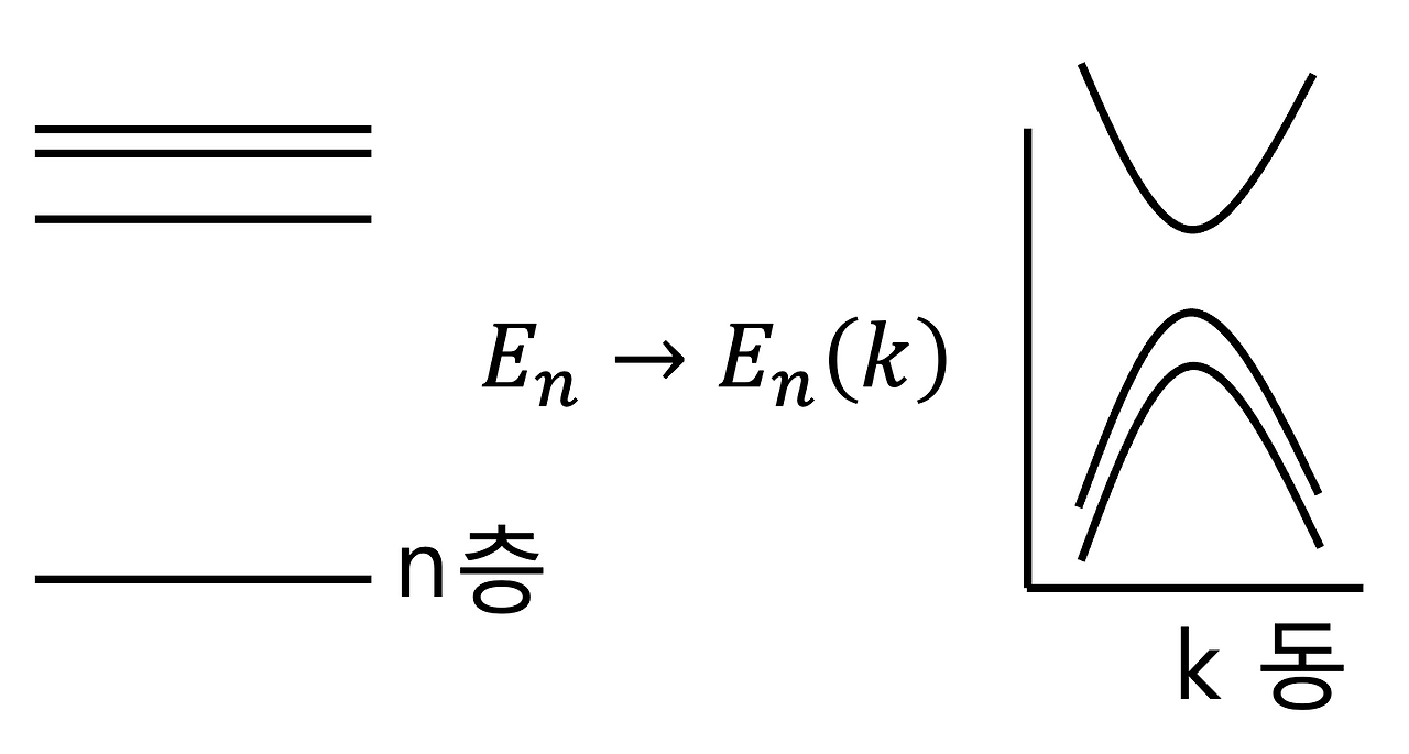 수소 분자의 경우에서와 마찬가지로 수많은 실리콘 원자들이 결합함으로써 수많은 에너지 준위를 만들게 될 것이다. 원자나 분자의 경우에는 에너지 준위가 건물의 층수처럼 번호를 매길 수 있었는데, 실리콘 결정처럼 원자들이 일정한 규칙을 가지고 배열된 경우는 에너지 준위들을 기술하기 위해 한 가지 주소가 더 필요하다. 비유하자면, 아파트가 한 동 있으면 몇 호인지만 알면 주소를 표현할 수 있지만, 여러 아파트가 있는 단지의 경우에는 어느 동인지 추가로 표시할 필요가 있을 것이다. 고체에서 전자가 처한 상황이 이와 유사하며, 에너지 준위를 아래 그림 안의 수식과 같이 표시하게 된다.