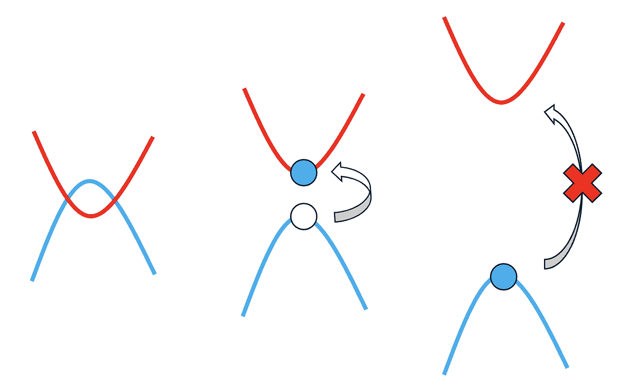 띠 사이의 간격이 작다면, 가전자대의 전자가 전도대로 올라가 꽤 자유롭게 물질에서 움직일 수 있게 된다. 수소 원자에서처럼 빛을 흡수해서 올라갈 수도 있고, 열에너지 때문에 올라갈 수도 있다. 이렇게 전자가 올라가게 되면 위의 그림에서처럼 (흰색 원으로 표시된) 전자가 빈 자리가 생기게 된다. 이렇게 빈 자리를 특별히 정공(hole)이라고 부른다. 반면 띠 사이의 간격이 크다면, 그런 일이 매우 드물게 일어나기 때문에 전류가 흐르지 못한다. 즉, 반도체와 부도체의 차이는 띠틈의 크기의 정도에 따라서 구분되는 것이다. 딱 떨어지는 기준은 없으나, 대체로 3 eV 이하의 물질을 반도체라고 부른다. 띠틈이 없는 물질, 즉 완전히 채워지지 못한 띠가 있는 물질은 도체가 된다.