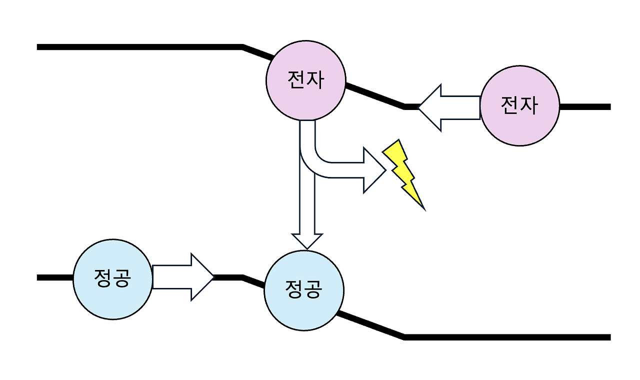 우리가 흔히 사용하는 LED는 영어로 Light-Emitting Diodes의 두문자어(acronym)이다. 즉 LED는 빛을 방출하는 다이오드이다. 다이오드는 한 방향으로 전류가 흐르는 전자 부품인데, 앞서 살펴봤던 것처럼 pn 접합도 다이오드의 일종이다. p형 반도체를 양극(anode)에 연결하고, n형 반도체를 음극(cathode)에 연결하면 LED를 만들 수 있다. LED를 껐다 켜기 위해 스위치도 추가해 주면 좋을 것이다. 스위치를 닫으면 양극과 음극 사이의 전위차에 의해 전류가 p형 반도체에서 n형 반도체로 흐르게 된다. 이 경우 전자는 n형에서 p형으로, 정공은 p형에서 n형으로 흐르게 된다. 서로 다른 두 전하를 띈 입자들이 두 반도체의 경계면에 도달하게 되면 재결합(recombination)하게 되며, 결과적으로 빛이 방출되게 된다. 이런 현상을 전기 발광(electroluminescence)이라고 하며, LED의 기본 동작 원리이다. 전류가 흐르기 때문에 어느 정도 열이 발생할 수는 있지만, 백열등이나 형광등에 비해서는 열이 덜 발생해 (상대적으로) 차가운 광원으로 여겨진다.