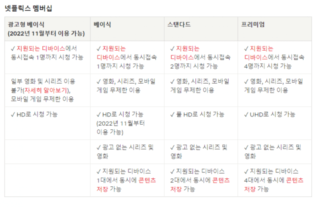가격이 저렴한 대신 콘텐츠 재생 전과 중간에 15초 또는 30초 분량의 광고를 봐야 합니다. 시간당 평균 4분 정도 정도의 광고를 봐야 하며, 동시 접속 1명 제한, 영상 화질 최고 720p HD급 등 일부 서비스에 대한 이용 제한도 있습니다.