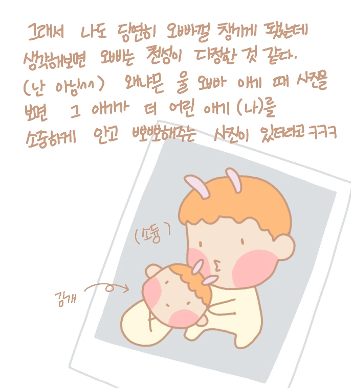 주변 형제자매 얘기를 들어보면 어렸을 때는 툭탁거리며 싸웠다고 많이 들었는데 싸웠던 적이 저희는 거의 없었어요. 아마 뭔가 서로 감정이 상했다면 거의 다 제가 잘못해서 오빠가 혼냈다거나-정도였을까.. 그것도 열손가락 안에 손꼽히는 것 같아요.