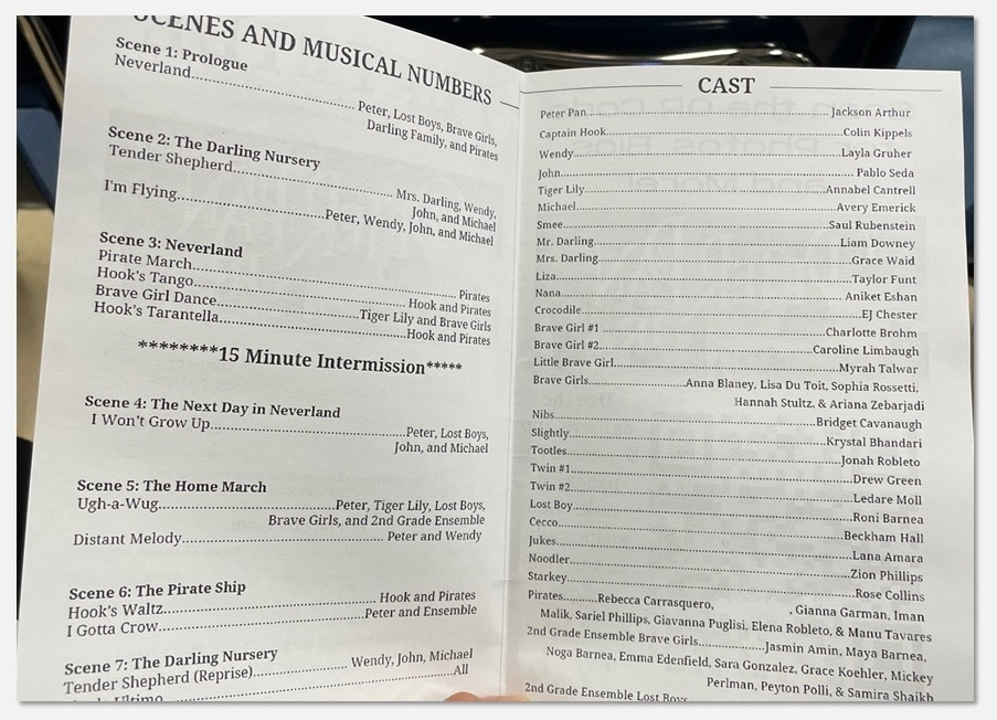 Peter Pan, Wendy, Captain Hook, Tigere Lily, 등 주요 배역부터 Pirates, Brave Girls 등 앙상블 단역들까지 배역이 다양하다. 대략 50여 명이 참여하는 듯싶다.
