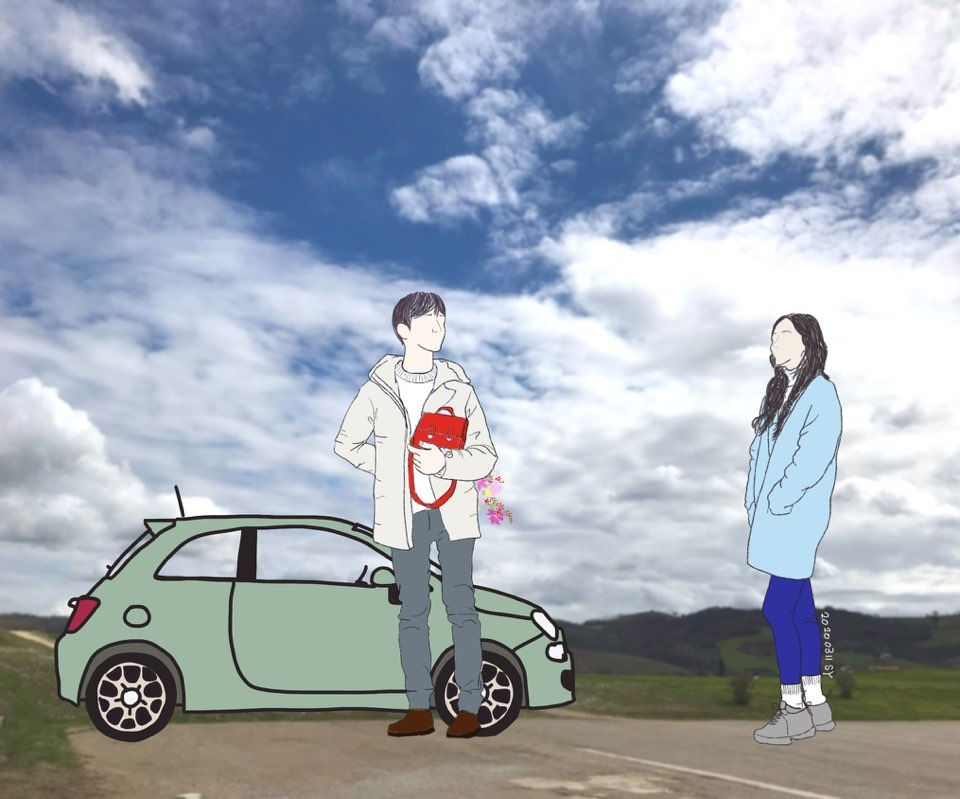 좁은 도로를 따라 걸어가는데, 빈 도로를 따라 그녀를 마주하고 거리를 좁히던 작은 차 한 대가 멈춰 섰다. 조그만 차에서 어울리지 않게 커다란 그가 내렸다. 어색하게 인사하는 그녀에게 그는 웃으며 작은 빨간 크로스백을 건넸다. 밝은 아침의 빛 때문인지, 그가 내린 상황의 어색함 때문인지, 그가 내민 가방 때문인지, 그가 애써 감추려는 수줍은 꽃다발 때문인지 그녀는 오류가 난 기계처럼 잠시 멈춰있었다. 멍하니 가방을 받아든 그녀를 보고, 그가 웃더니 “You're welcome."이라 말문을 연다. 그녀는 가방을 보다가, 그를 다시 보고는 메모지 아래 추가할 말들을 생각한다. 두고왔던 가방, 별, 그리고 그의 이름을 적어야겠다고 생각하며 그녀는 그에게 한 걸음 가까이 다가선다.