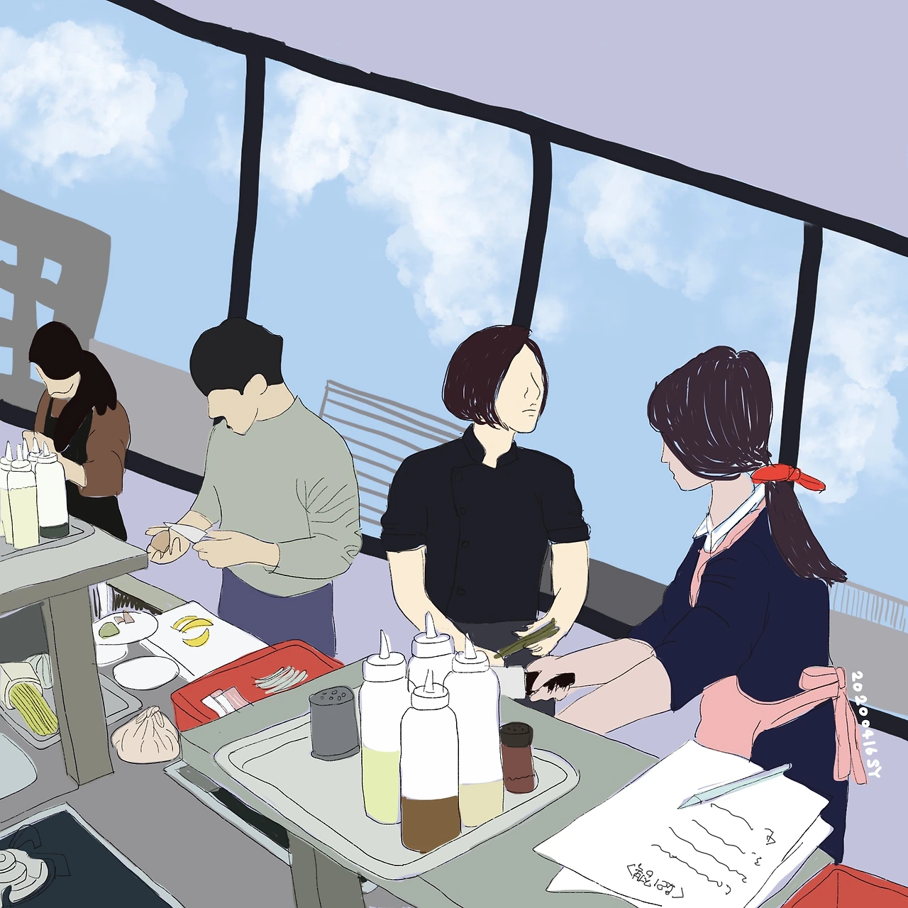 메인 요리와 디저트를 순식간에 만들어내는 선생님을 넋을 놓고 보고 있었는데, 막상 그녀가 요리를 시작할 시간이 되자 그녀의 손이 말을 듣지 않았다. 파스타에 들어갈 양파, 마늘, 파슬리를 자르는데 손가락도 같이 자를 것만 같았다. 식은땀이 흐르고 있는데 기척도 없이 선생님이 다가왔다. 선생님은 그녀의 손이 있어야 할 자리와 칼이 있어야 할 자리를 얼른 알려주고 떠나버렸다. 그녀는 오늘 메뉴에 칼을 쓰는 일이 이것밖에 없음에 감사했다. 메인 요리인 고르곤졸라 크림 파스타를 위한 파스타를 삶고, 팬에 재료를 넣고 볶다가 면을 넣고, 우유와 생크림, 치즈를 넣고 끓이는 일은 선생님의 목소리를 기억하며 따라 하다 보니 어느새 그럴듯한 냄새가 났다. 뿌듯한 표정으로 서 있는데, 선생님이 어느새 다가와 있었다. 마지막에 불을 끄고 버터를 조금 넣어서 녹이라는 조언을 따라 파스타의 색이 완전히 그녀가 아는 것으로 변하는 것을 본 뒤에 살짝 맛을 본 그녀는 감탄했다. 하지만 선생님은 다른 제자들이 디저트를 시작했는지 점검하고 다니기 시작했고, 그녀도 얼른 바나나 푸딩을 위한 냄비를 꺼냈다. 냄비에 우유, 계란 노른자, 밀가루, 설탕을 넣어서 젓고, 불을 올리자 또 선생님이 다가왔다. 초보들이 하는 실수는 불 조절이라며, 이게 불이 켜진 건가 싶을 정도로 불을 줄여주고 갔다. 그녀는 늘 냄비에 든 것이 바글바글 끓을 정도로 큰 불꽃이 켜져야 요리를 하는 것인 줄만 알았다. 선생님의 마법처럼, 천천히 따라 하다 보니 정말 좋은 냄새가 나는 커스터드 크림이 생겨났다. 생크림을 휘핑하느라 팔이 좀 아팠지만, 결과물을 살짝 맛보니 노력의 대가로 그 정도는 지불할 만하다는 생각이 들었다. 그녀가 파스타와 푸딩을 끝마친 시간, 다른 사람들처럼 그녀도 그릇에 예쁘게 담고 사진을 찍었지만 반찬통에 다시 담는 사람들과 달리 그녀는 파스타를 입으로 밀어 넣고 있었다. 집에 가져가도 어차피 그녀가 먹을 테고, 다 식어서 맛이 없어지기 전에 전리품을 즐겨야 했기 때문이었다. 그녀는 구석 자리에서 선 채로 허겁지겁 그녀의 작품을 먹으며 왜 엄마에게 주방에 서서 먹는다고 타박했을까, 잠시 자신을 성찰했다. 그리곤 조금 많이 만든 바나나 푸딩은 조심조심 반찬통에 싸서 행복한 기분으로 집으로 돌아왔다.
