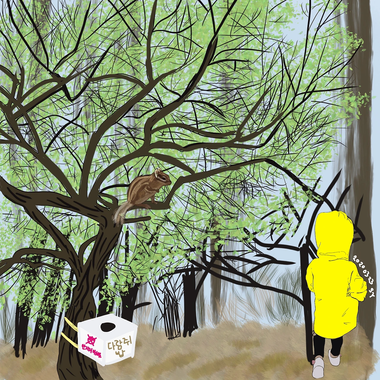 작은 꼬리 다람쥐가 이번엔 바위산으로 여행을 떠나려는데, 어제 봤던 소녀와 엄마가 작은 나무들을 지나 키 큰 나무들의 숲 앞까지 걸어오는 모습이 보였습니다. 작은 꼬리 다람쥐는 키 큰 나무 위에서 조용히 지켜보았지요. 작은 소녀와 엄마는 처음 만난 키 큰 나무 아래에 작은 상자를 매달았습니다. 작은 꼬리 다람쥐와 동글이 다람쥐처럼 몸이 작은 친구들만 들어갈 수 있는 구멍이 있는 작은 상자였지요. 작은 꼬리 다람쥐는 사람들이 가고 난 후 그 상자에 가까이 다가갔습니다. 작은 꼬리 다람쥐는 이해할 수 없는 이상한 그림이 그려져 있었고, 안에는 맛있는 것들이 가득했습니다. 작은 꼬리 다람쥐는 꼭 동글이 다람쥐를 찾으면 이 상자에 대해 이야기해줘야겠다고 생각하며, 작은 볼을 채워 여행을 떠났습니다. 그 상자에는 삐뚤빼뚤하지만 이렇게 쓰여있었습니다. ‘다람쥐 밥! 만지지 마세요.’