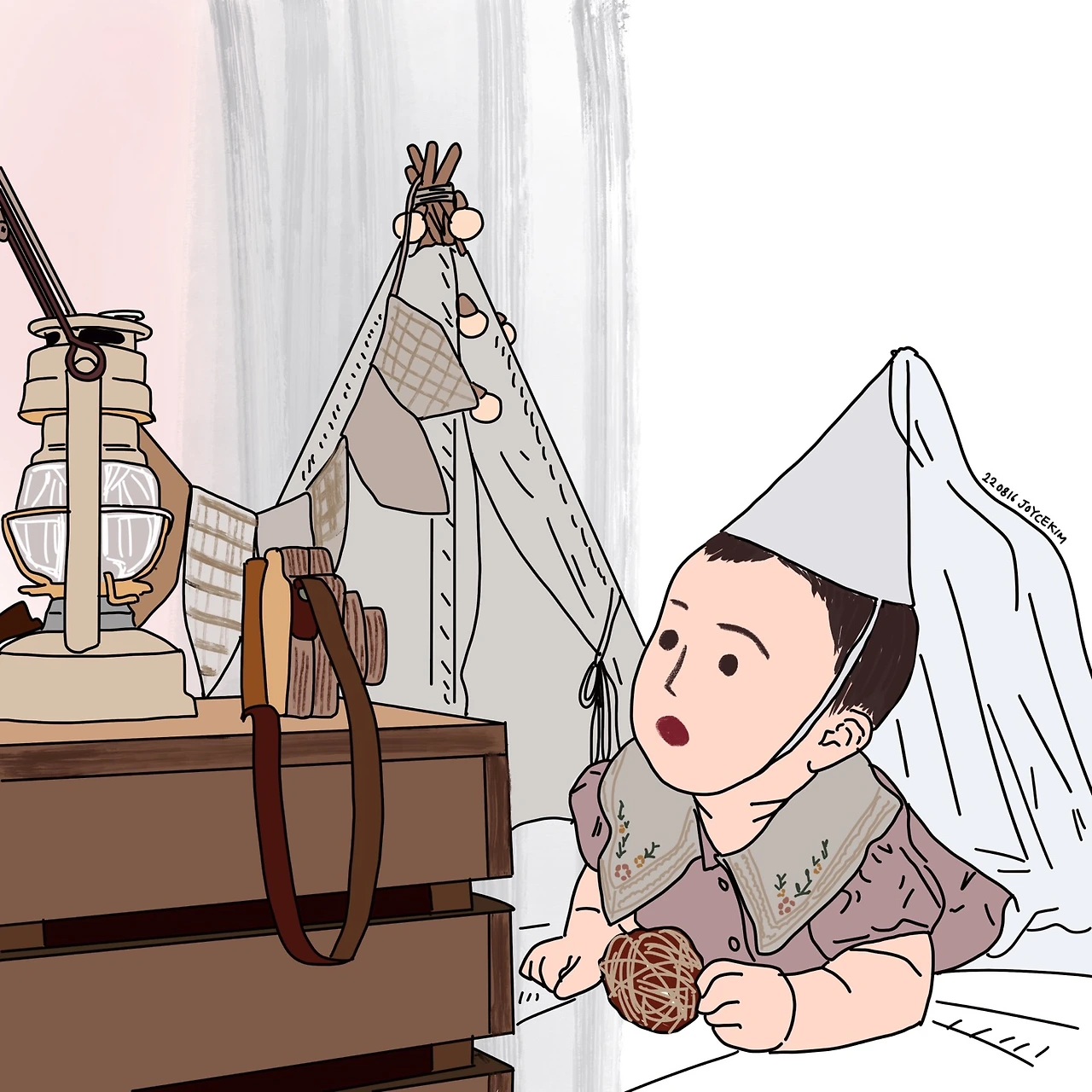 열심히 고르고 고른 캠핑 콘셉트의 셀프 촬영 소품은 금요일에 도착했다. 물론 마음 같아서는 도착하자마자 풀어서 세팅해두고 아기가 기분 좋은 시간에 사진을 찍고 싶었지만, 생각처럼 쉽지 않았다. 남편이 돌아왔지만 좀비나 다름없는 상태여서 원래 하던 아기 케어에 남편 케어도 해야 했기 때문이다. 남편은 놀라울 정도로 자기 자신에게 신경을 쓰지 않는 스타일이라서, 컨디션이 조금 안 좋을 때 세심히 보지 않으면 크게 앓을 때까지 스스로 눈치를 못 채기 때문이었다. 어쩐지 아기와 둘이서만 있을 때보다도 더 바쁜 느낌이라, 저녁이 되어서야 아기 방에 촬영 소품들을 하나씩 꺼내 두었다. 토요일에는 정말 기분 좋을 때 꼭 사진을 찍어야지, 다짐했다.