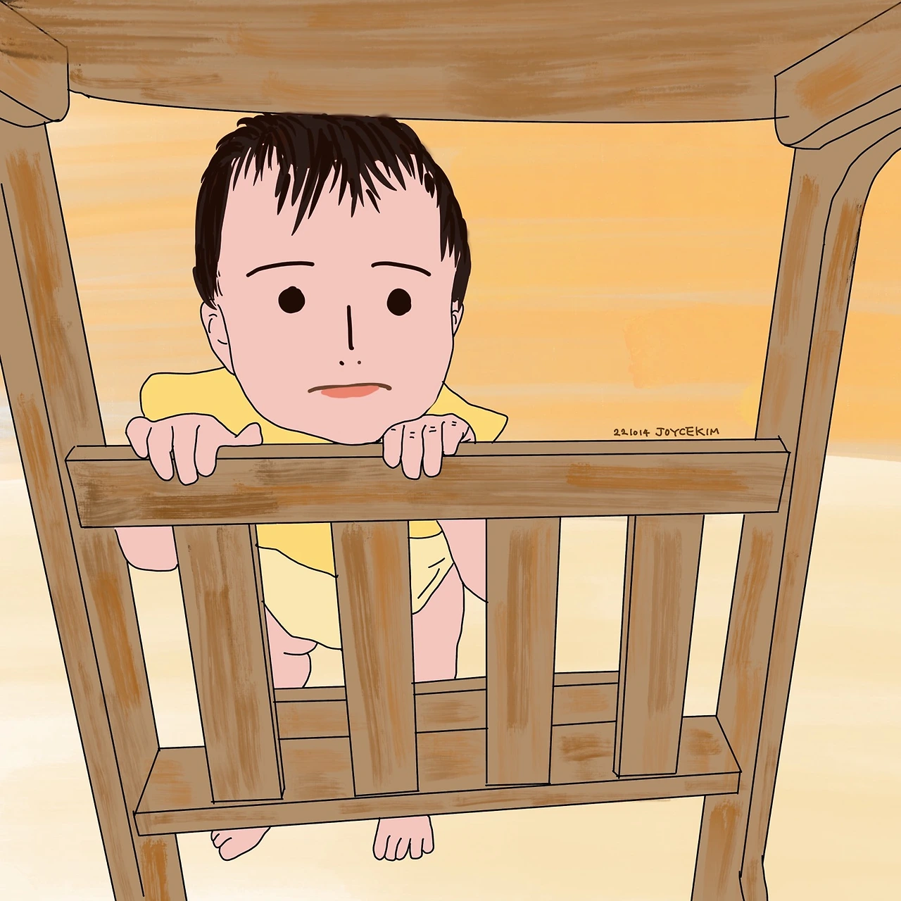 혼자 놀아주기를 기대하면서 장난감을 잔뜩 펼치고 아기가 마음껏 기어 다니게 두었는데, 그날 따라 소파 위에 누워있는 나에게만 관심을 가지며 아기가 자꾸 기어 왔다. 아직 어른이 잡아주지 않으면 서지 못하는 아기라 안심하고 좀 더 쉬고 있었는데, 소파 앞에 둔 작은 테이블로 기어가서 혼자 용을 쓰더니 기둥을 잡고 엉덩이를 들기 시작했다. 설마 하면서 조금 더 지켜보고 있었는데, 맨 위 선반 면을 양 손끝이 하얘지도록 꼭 붙잡더니 허리를 완전히 세워서 서는 것이 아니겠는가? 그러고는 테이블 위에 놓인 리모컨을 잡으려고 짧은 팔을 휘저으며 마음대로 되지 않자 소리를 지르며 안타까워했다. 그 모습이 너무 웃기고 대견하기도 하면서 신기해서 얼른 동영상을 켜고 촬영을 시작했는데, 아무래도 처음이다 보니 금방 무게중심이 무너져서 한 팔을 놓쳤다. 그러더니 도와달라고 엄청 울어서 제대로 촬영을 할 수가 없었다.