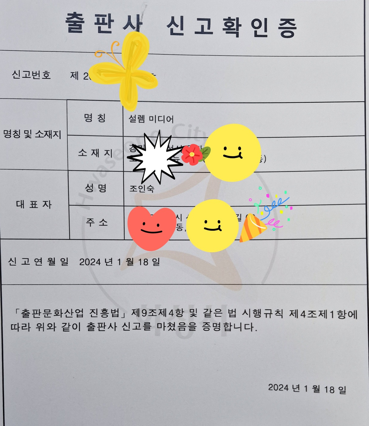 출판사 이름은 설렘미디어입니다. 출판과 더불어 강의, 공연, 도소매, 방송,전자책 등도 겸할 계획이어서 미디어라는 명칭으로 정했어요.