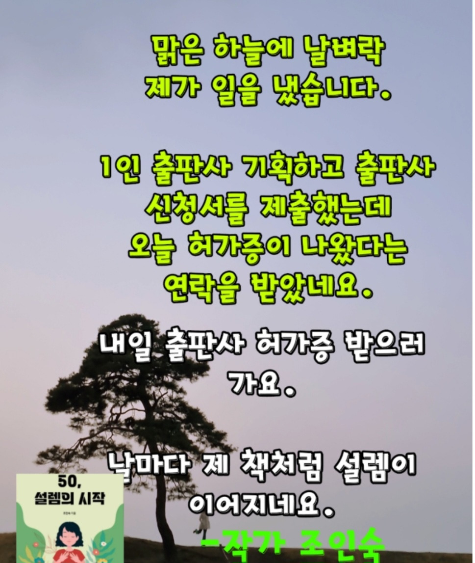 오늘 두 번째 설렘은 바로 제가 출판사 대표가 되었다는 사살입니다. 책을 쓰고 난 후 출간이라는 현실에 직면하잖아요? 제 책만 해도 올해 6권을 출간해야 하는데, 출판사 고르고 계약하는데 시간과 노력과 금전적인 문제에 도달할 수밖에 없어요.