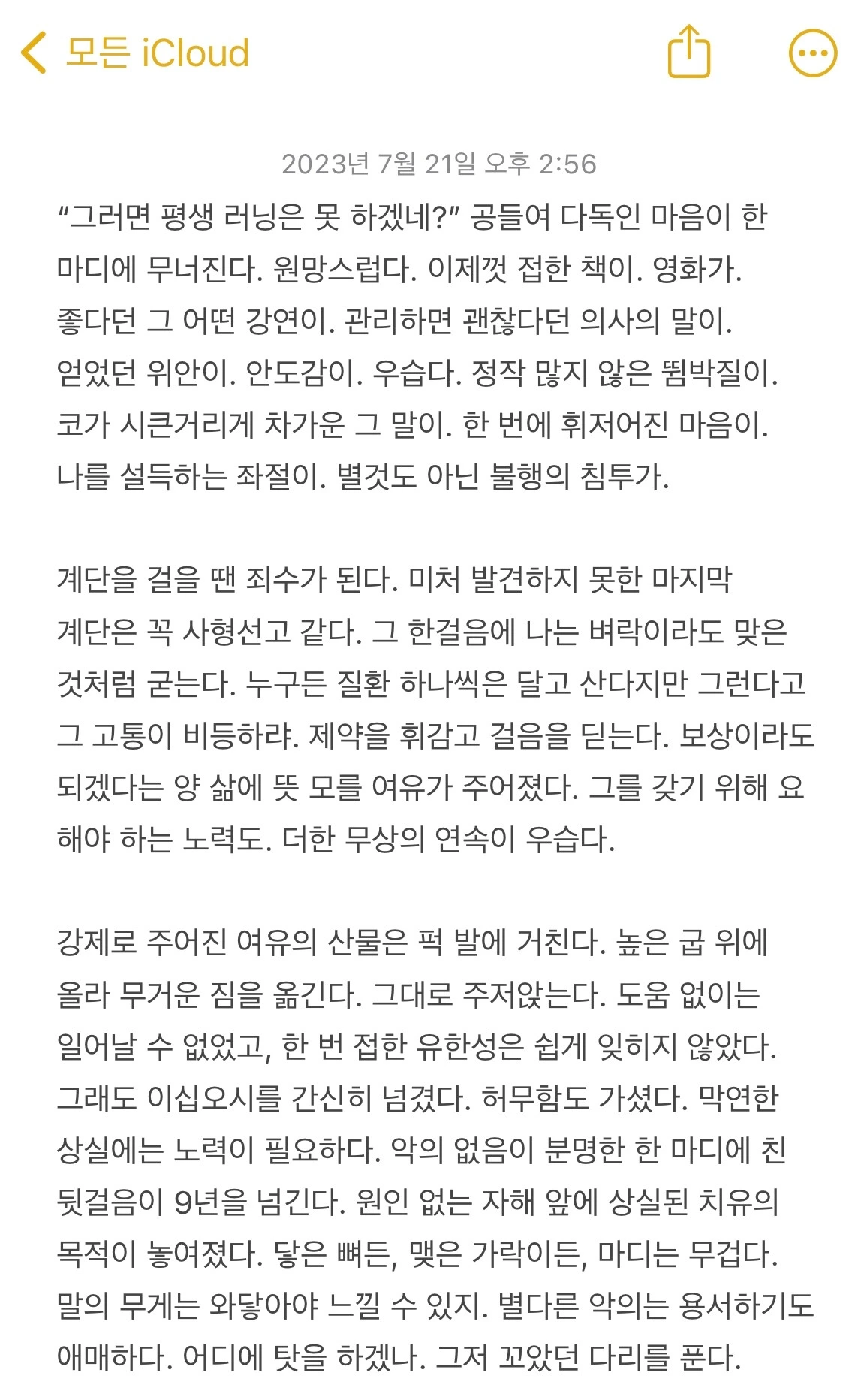 어느 날 누군가 나에게 평생 러닝은 못하는 거냐고 물어봤어요. 표정이나 눈동자를 보아하니 진심으로 걱정하는 것 같아 괜한 오해는 안 했어요. 그래도 겨우 이거 하나로 격려받는 게 불쾌해 오래 생각에 잠겼어요. 이건 그때 쓴 일기예요. 2023년 여름에.