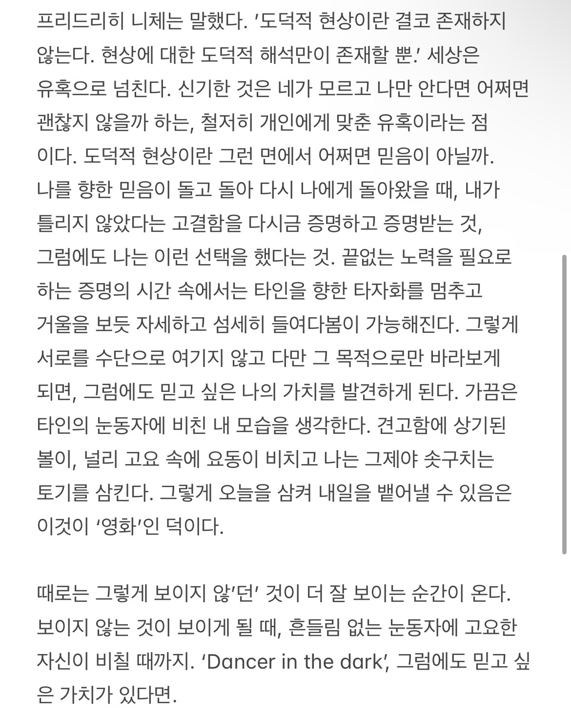 그렇지만, 내가 20살 때 품었던 기대와 존경심 같은 것들이 그들을 힘들게 했을 수도 있겠다는 생각도 해요. 요즘 느껴요. “너는 그래도 다른 정답을 말해 줄 것 같아“ 라며 앞이 보이지 않는 두 갈래의 길 중 자신이 어느 쪽으로 가야 할지 정해 달라는 질문을 자주 받거든요. 아마 제가 ‘어떤 사람으로 보이고 싶다-’ 하는 이미지를 꾸준히 전시한 덕분이겠죠? 하지만 죄송하게도 저는 그다지 성숙한 사람이 아니라 타인의 인생에 관여하거나 아무리 작은 선택이라도 그들을 좌지우지할 자격이 없는 것 같습니다.. 한편으로 내가 아직 나 자신도 제대로 돌보지 못하고 있는데 지나간 세월을 살아온 입장으로서, 타인에게도 제대로 된 도움을 줄 수 없다는 무력감도 느끼게 해요. 당시의 언니 오빠들도 저의 초롱한 눈망울에서 당신들의 당황한 얼굴을 마주했을까요? 어둠 속의 댄서 속 셀마처럼요. 늦었지만 말하고 싶어요. 그런 의도는 아니었어요.